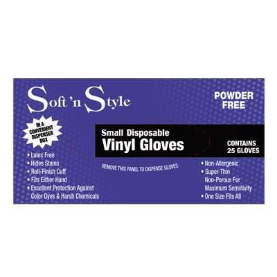 Soft ‘n Style Vinyl Gloves / Small / 25 per Box. Small vinyl gloves, powder free, non-allergenic. 25 gloves in dispenser box.