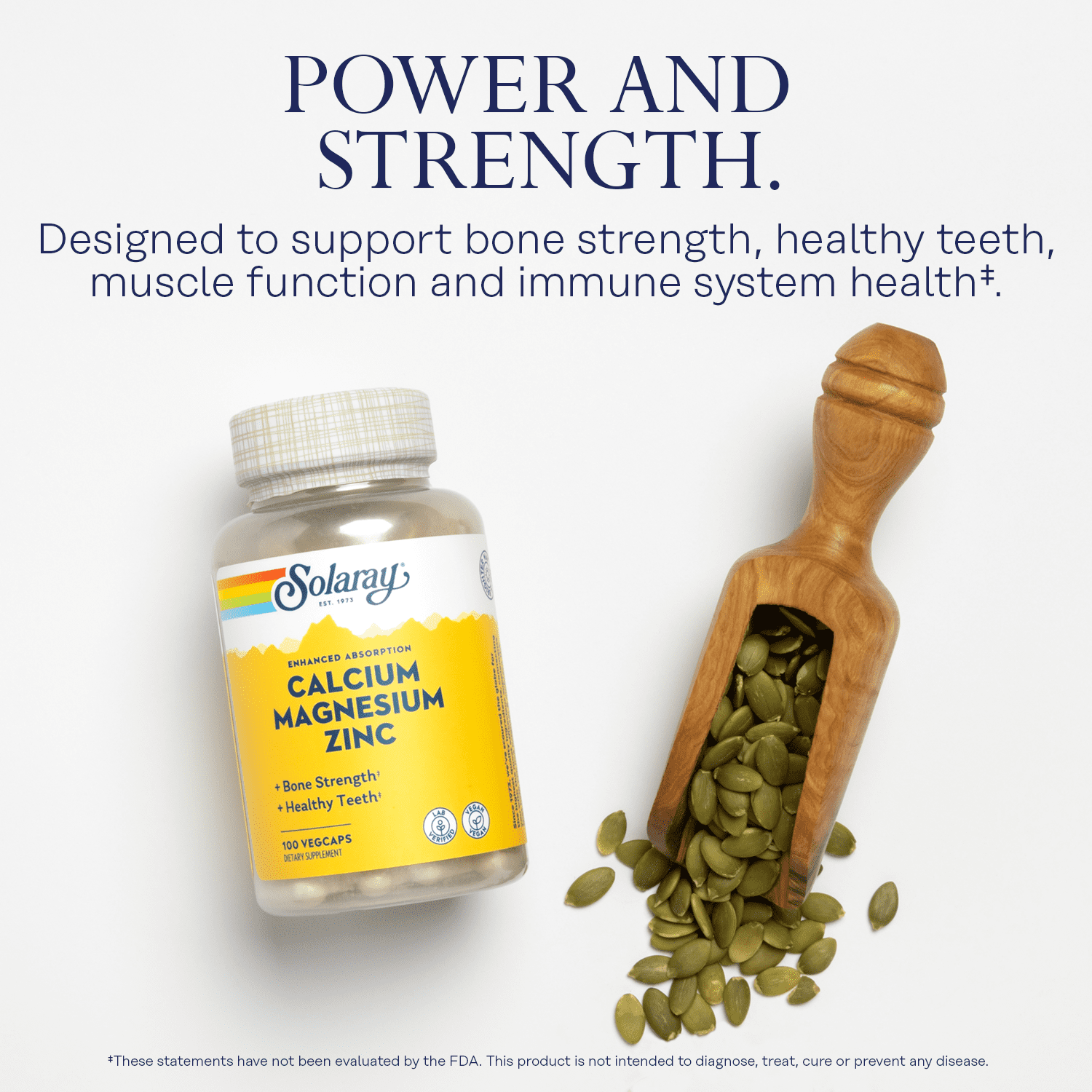 Calcium, magnesium and zinc are essential minerals that help maintain healthy bones and teeth, muscles and immune system function. Solaray Cal Mag and Zinc vegan capsules are easy to swallow and contain a bounty of the finest nutrients including 1000 mg of calcium, 500 mg of magnesium and 25 mg of zinc.