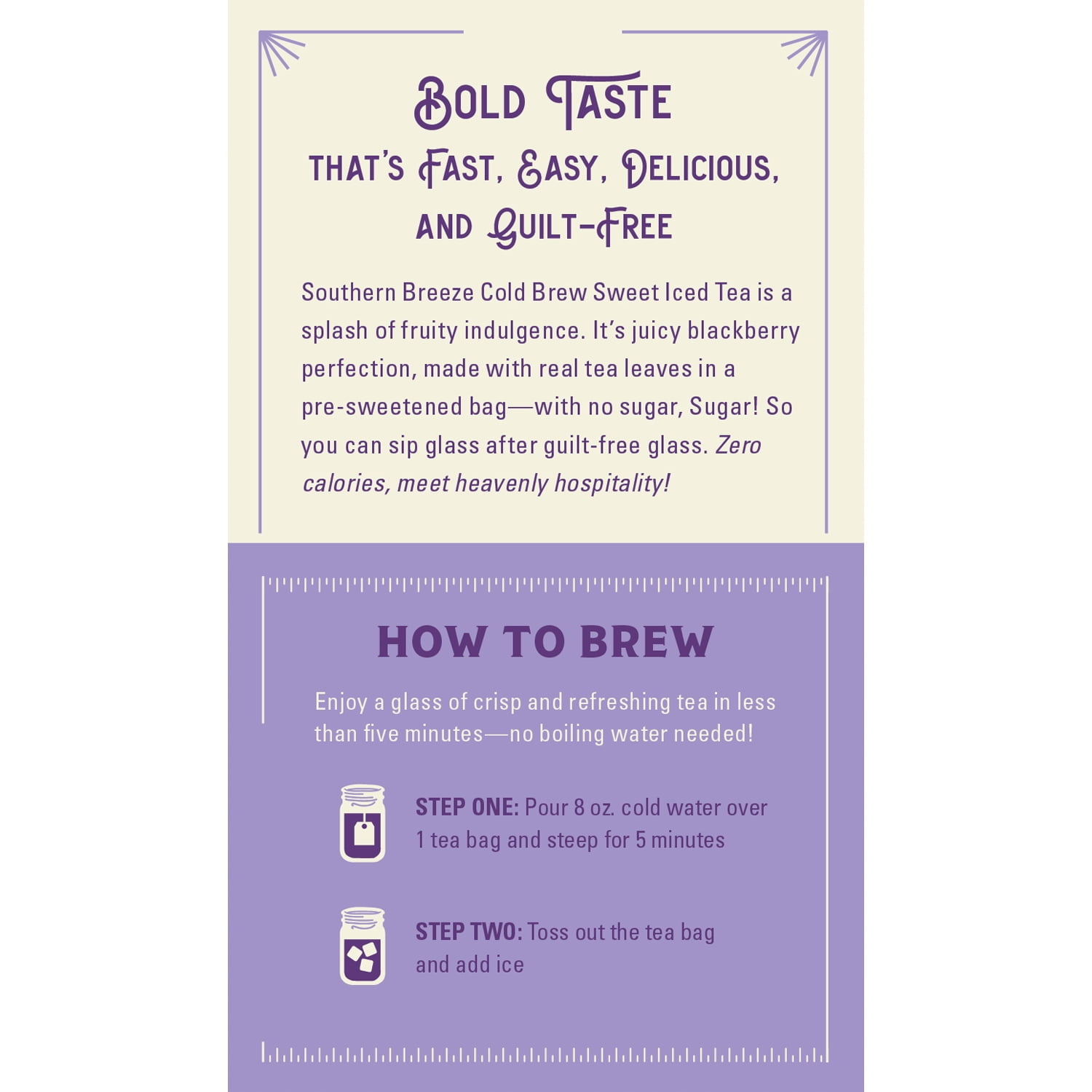Southern Breeze Blackberry Cold Brew Sweet Iced Tea is a splash of fruity indulgence. It’s juicy blackberry perfection, made with real tea leaves in a pre-sweetened bag that you cold-water brew, steep, chill and enjoy—and with no sugar, Sugar! So you can sip and share glass after guilt-free glass. Zero calories, meet heavenly hospitality!