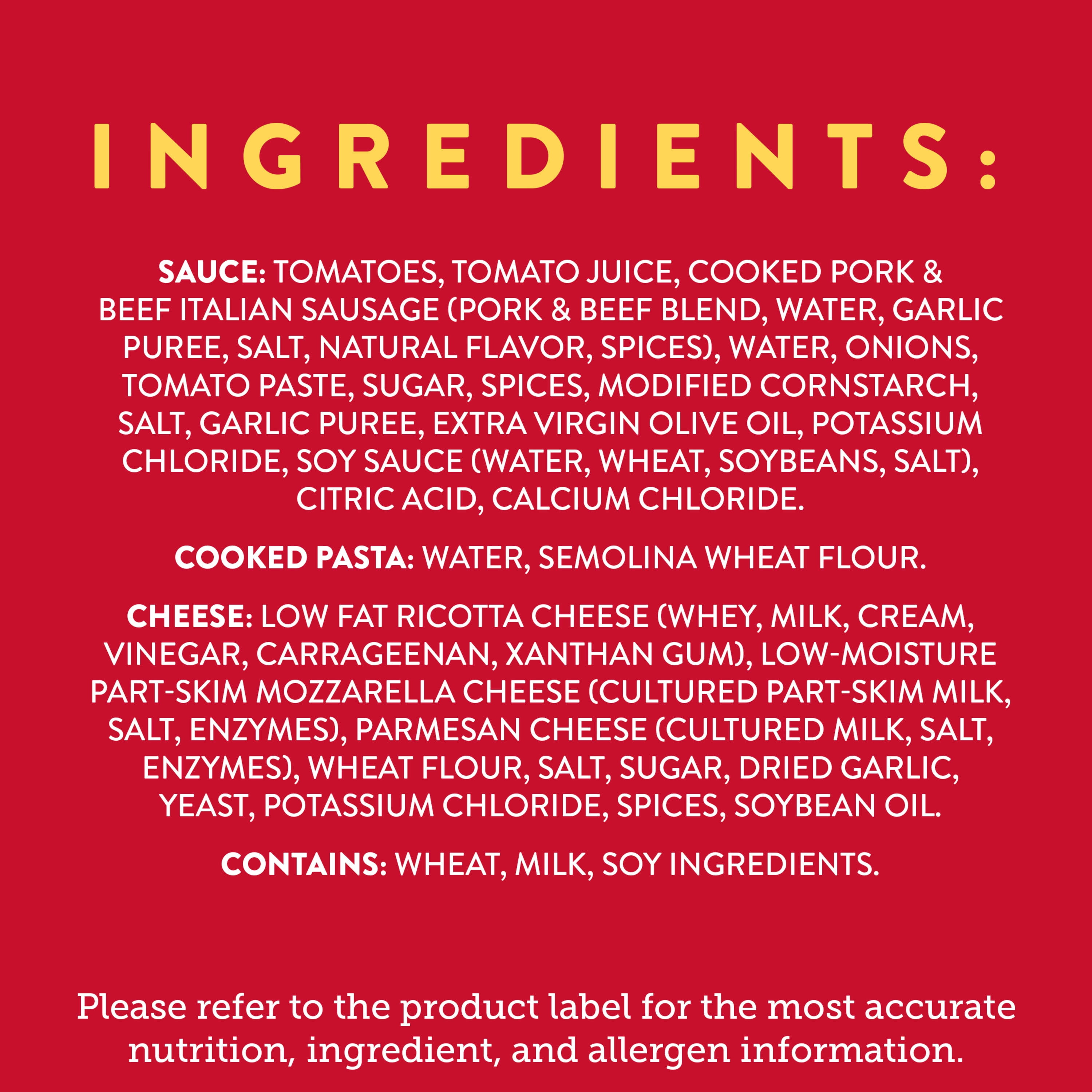 - Includes lasagna noodles, seasoned meat sauce, tomato sauce and low fat ricotta cheese