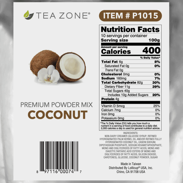 Tea Zone Coconut Powder is a premium powder mix great for making smoothies, milk teas, flavored milk, and various blended drinks. Tea Zone premium powders are securely sealed and designed to be resealable. after opening to maintain the quality of the powder. Powders should be store in a vacuum sealed power container and always use a dry, clean powder scoop.Coconut Flavor
