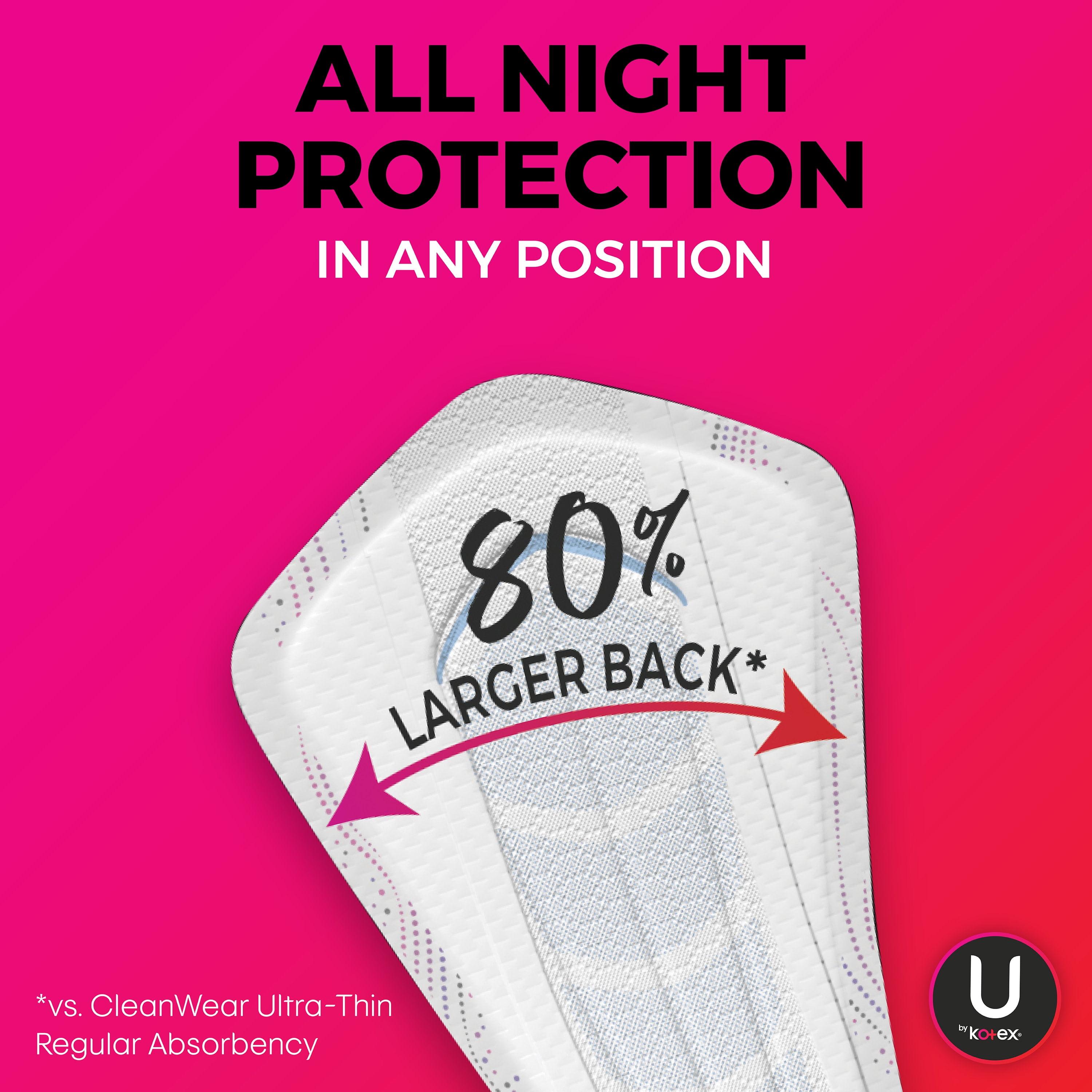 U by Kotex Allnighter Ultra Thin Extra Heavy Overnight Pads with Wings provide up to 100% leak free protection and have an 80% larger back* for all night protection in any sleep position. Experience worry-free sleep with the unique ComfortFlex design that fits and flexes with your body for outstanding skin comfort. Allnighter menstrual pads feature uniquely shaped Tru-Fit wings designed for a secure fit so you can rest easy. Ultra thin and absorbent, these overnight pads for women are individually wrapped in vibrant colors and patterns inspired by the latest fashion trends.For period protection during the day, try U by Kotex CleanWear Pads with Wings, available in two absorbencies – Regular and Heavy. U by Kotex feminine pads are FSA/HSA/HRA-eligible in the U.S. Packaging may vary from images shown.*vs. Cleanwear UT Regular Pad