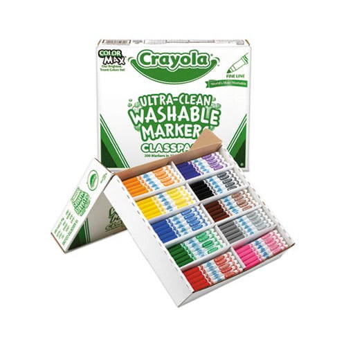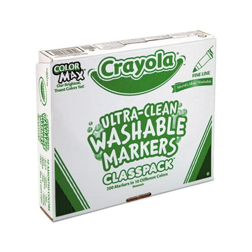 Vibrant colors feature the Crayola ultra-clean formula, which washes easily from skin, clothing, and now, painted walls 200-Count ClasspackIncludes 20 of each color and 12 extra marker caps. Marker Ink Type: Washable Marker Tip Type: Bullet Marker Tip Size text: Fine Marker Colors: Assorted.