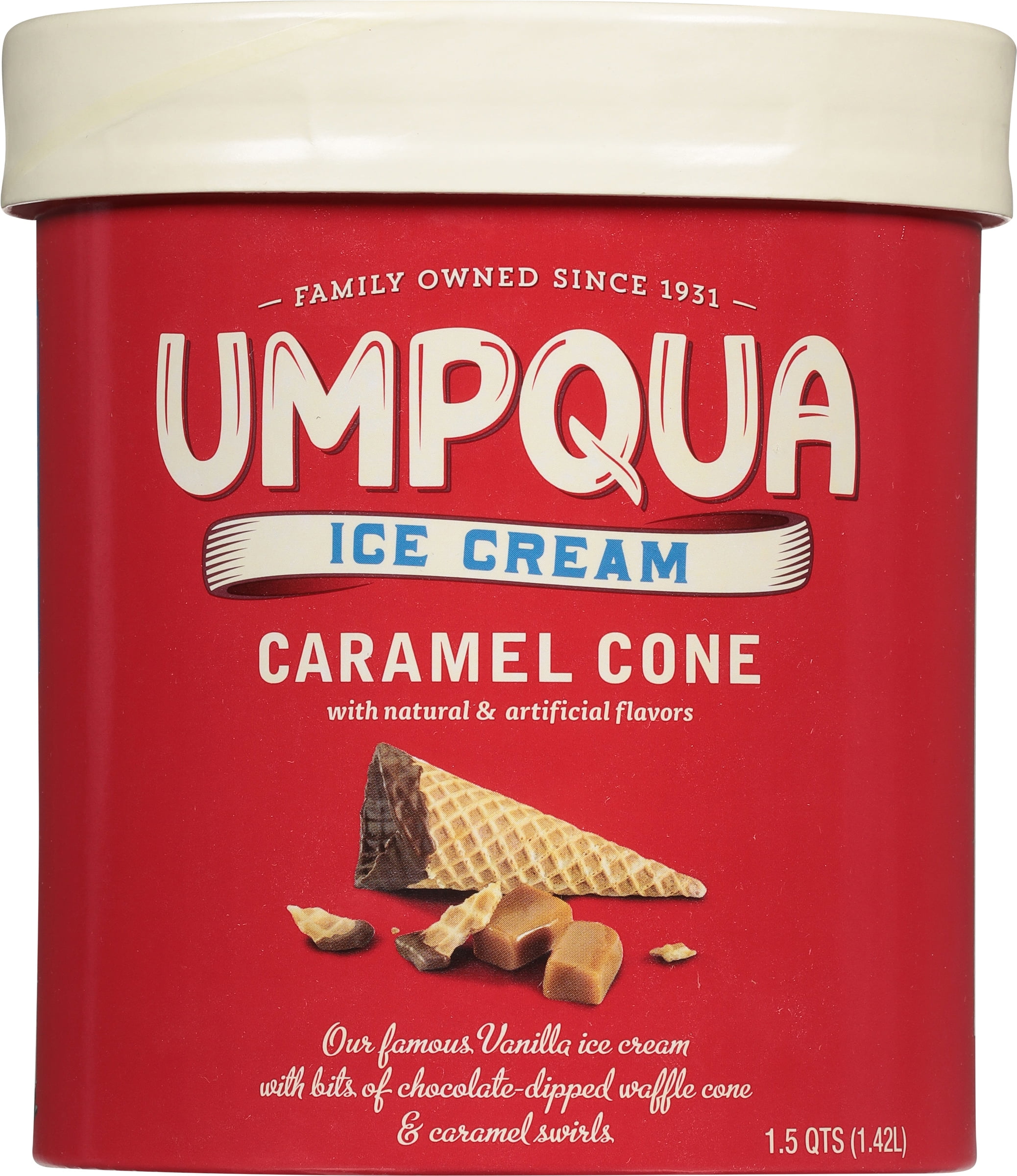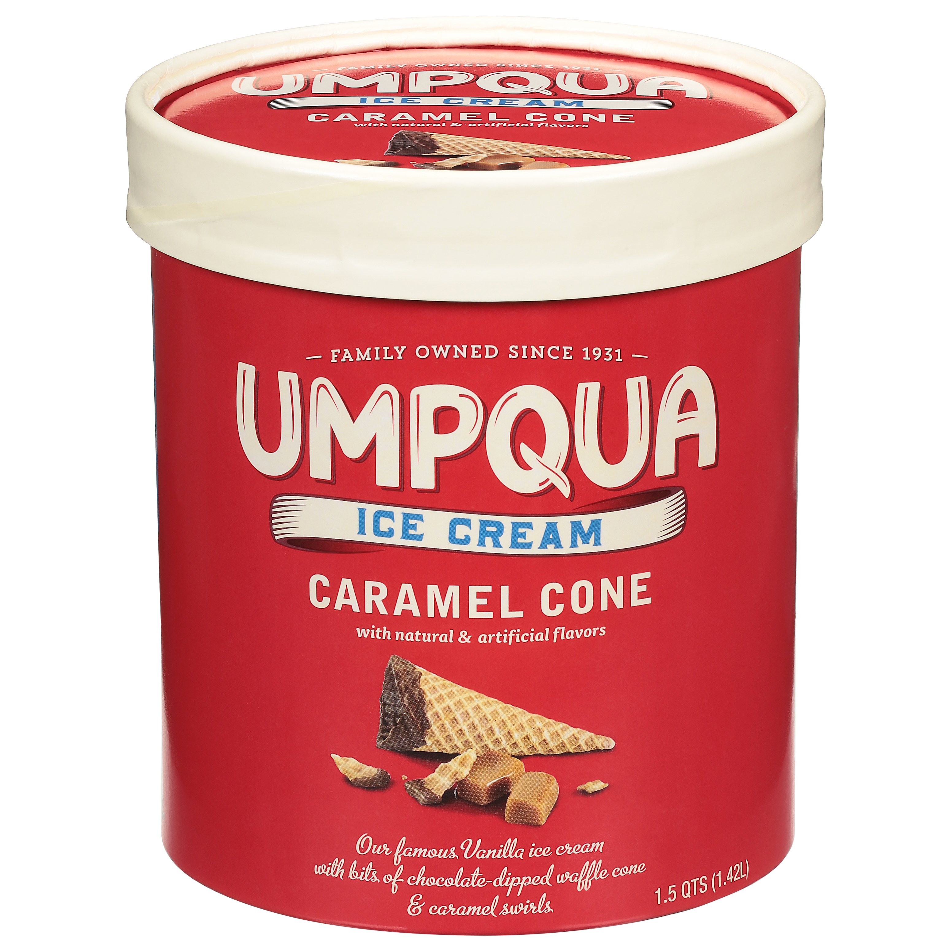 - Caramel cone with natural & artificial flavors. Family owned since 1931. Our famous vanilla ice cream with bits of chocolate-dipped waffle cone & caramel swirls. Ice cream is always a good idea. There’s just nothing quite like the pure joy ice cream brings. It’s that perfect blend of delicious flavor and creamy sweetness that keeps us all coming back for more. Our family’s promise has always been to produce the best quality ice cream using only the freshest cream and finest ingredients. From the beautiful ‘Land of Umpqua’ to your favorite bowl, and from our family to yours, we hope you enjoy the creamy goodness in each and every bite. Thank you for selecting Umpqua. Umpqua means: Thundering waters. Creamy goodness. Family owned. Highest quality. Fond memories. From cows not treated with rBST (According to the FDA no significant difference has been shown between milk derived from rBST treated and non-rBST treated cows. Save a trip to the ice cream shop with our caramel cone, featuring our famous vanilla ice cream swirled with a thick ribbon of buttery caramel and chewy bites of chocolate-dipped waffle cone. All of your favorites in one delicious bowl! www.umpquadairy.com. Join our family. Click the code.