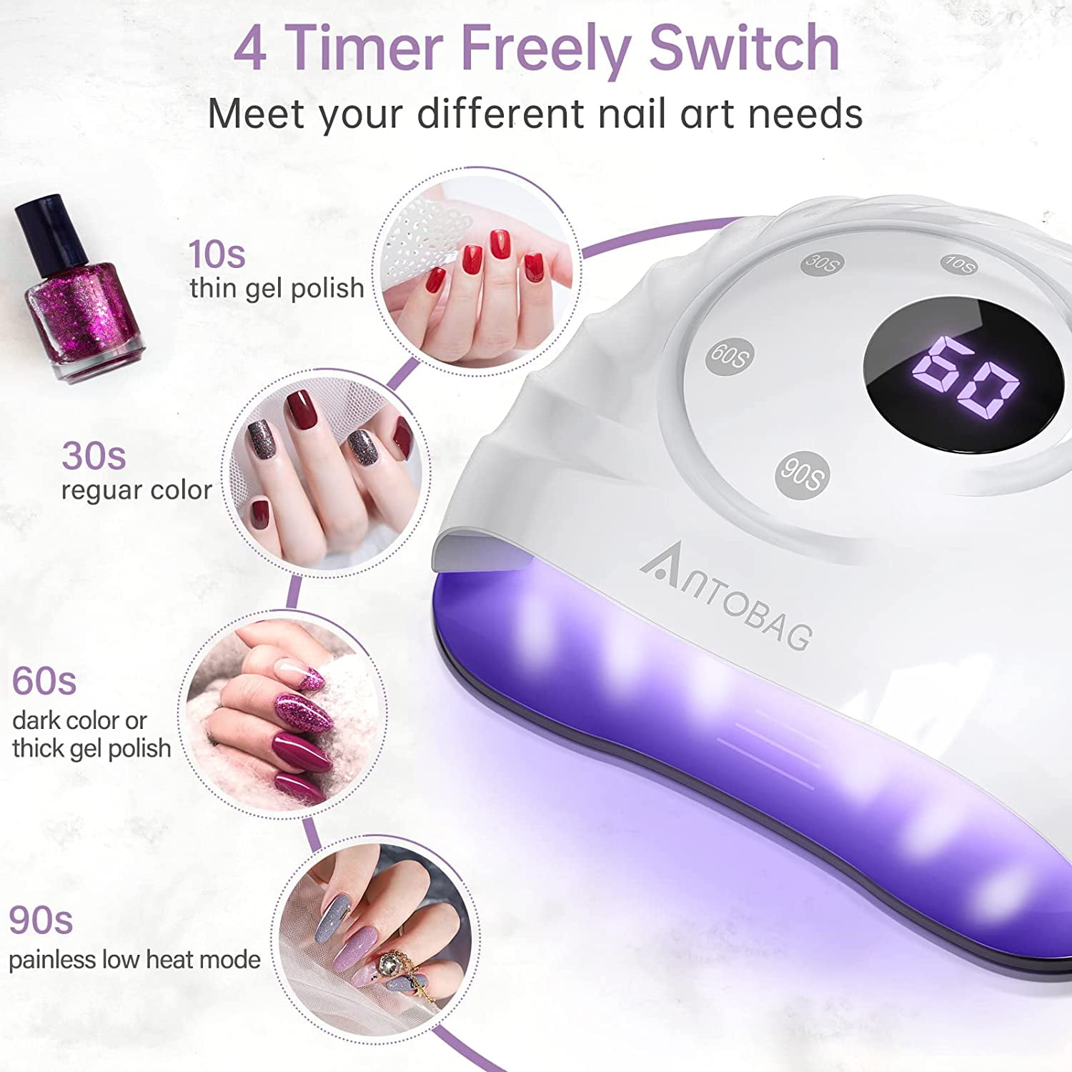 - 4 timers and automatic induction: nail dryer with 10s, 30s, 60s, 90s four different time settings, suitable for different types and thicknesses of gel. Built-in infrared sensor that can work automatically without setting a timer.