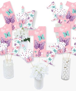 Big Dot of Happiness 1st Birthday Beautiful Butterfly – Floral First Birthday Party Centerpiece Sticks – Table Toppers – Set of 15