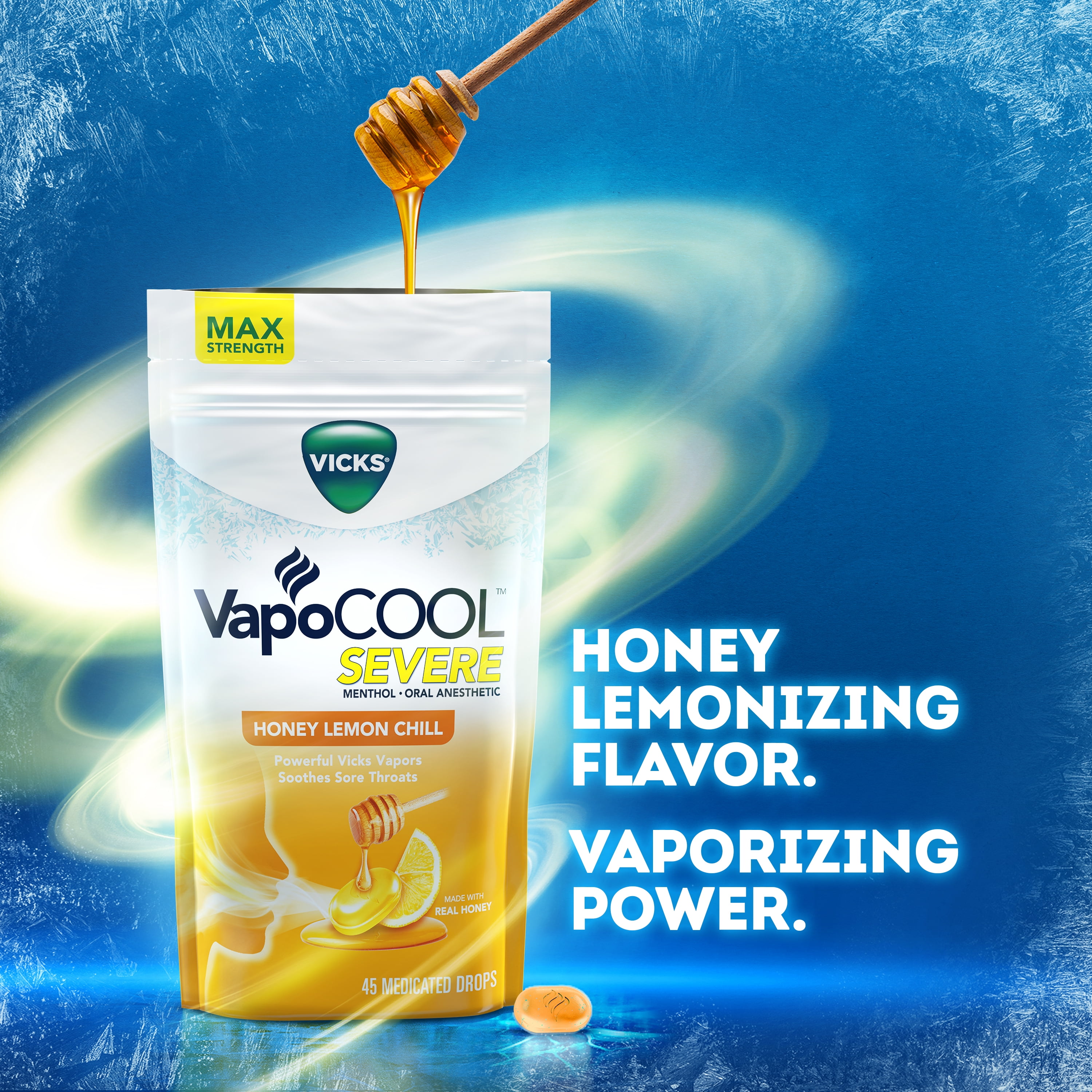 Vicks VapoCOOL SEVERE Medicated Lozenges, Honey Lemon Chill, 18 Drops – Soothe Sore Throat Pain Caused by Cough