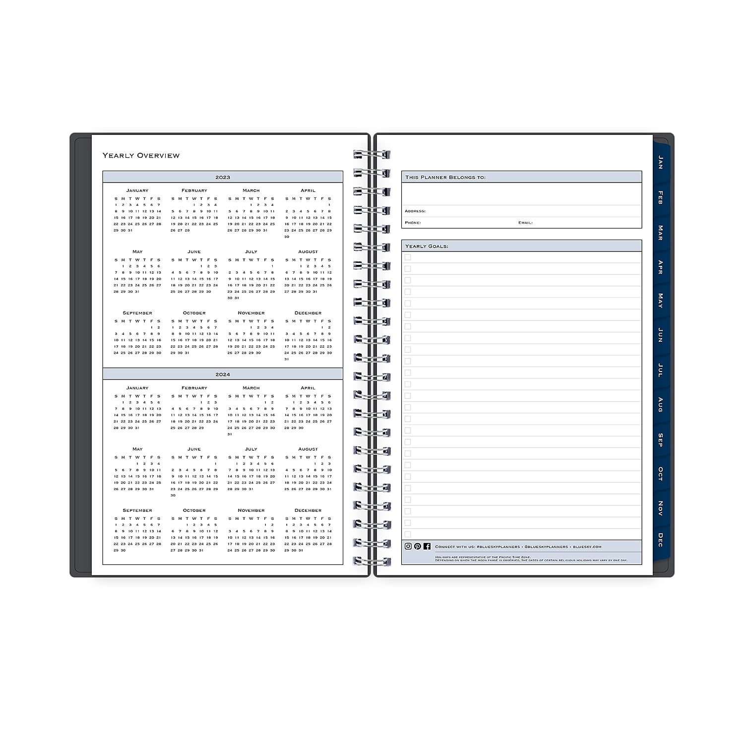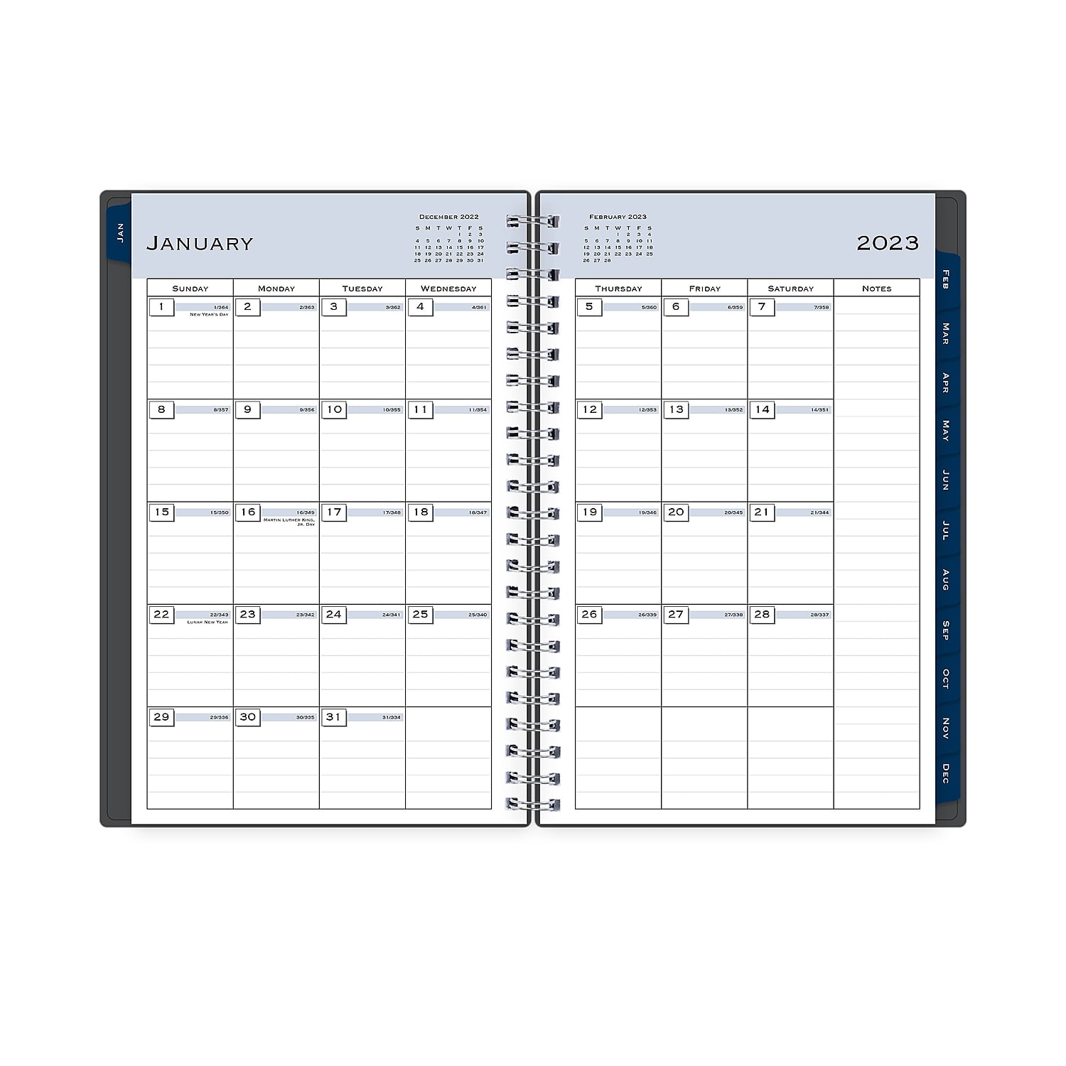 Professional and sleek, this Blue Sky 2023 weekly and monthly planner has everything you need to manage your time and be more productive, such as weekly and monthly planning calendars, dedicated notes pages, and reference calendars. The solid charcoal cover is flexible and office-ready. Dated January 2023 to December 2023. This 2023 planner has everything you need to manage your time and be more productive. Dimensions: 5" x 8". Weekly and monthly planning calendar covers a 12-month date range from January to December 2023. Two-page weekly and monthly calendar layouts offer extra writing space, extra notes pages, and reference calendars. Flexible cover features a Passages design in charcoal gray. Tabbed for quick access to the desired place. Durable twin-wire binding. Sold as 1 Each.2023 Blue Sky Passages 5" x 8" Weekly & Monthly Planner Charcoal Gray (100010-23)