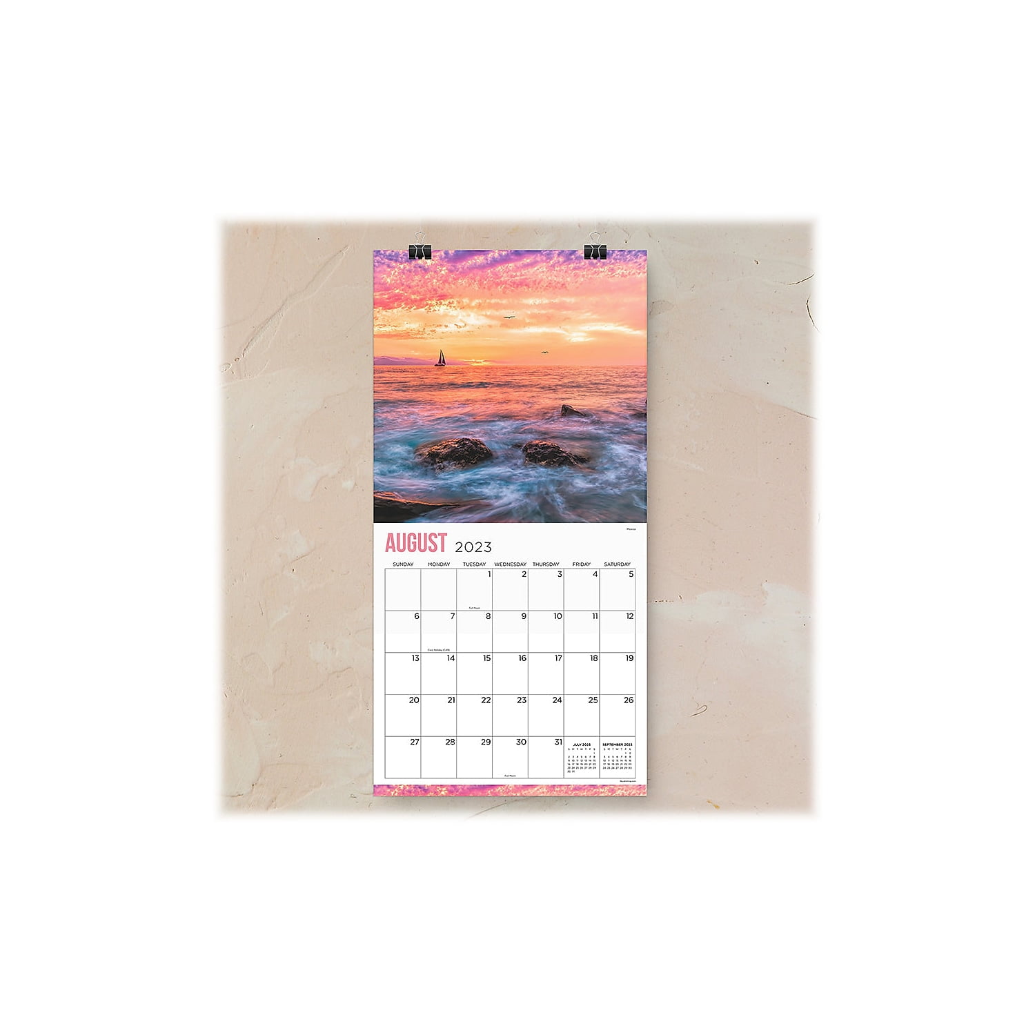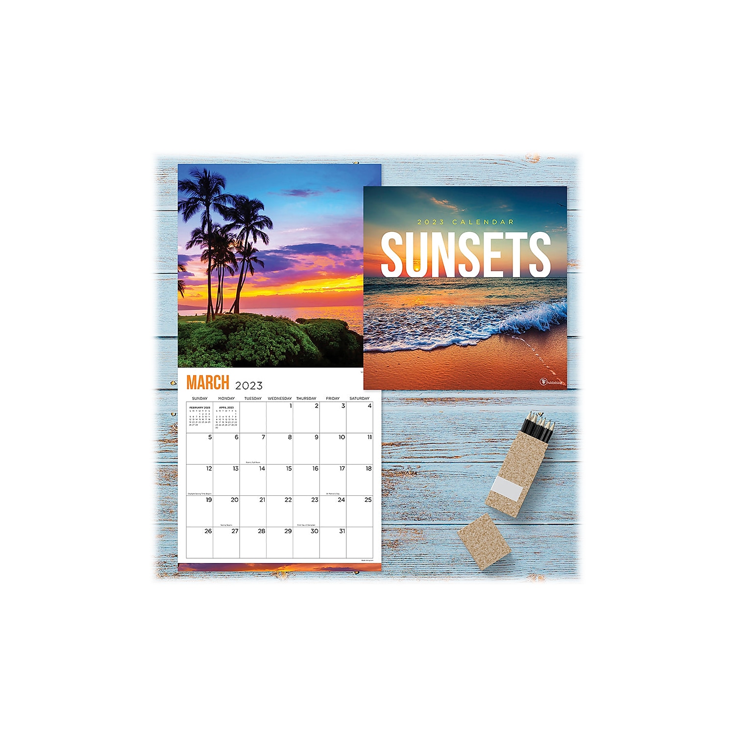 Take a moment and marvel at the beauty of nature around you. The vibrant blues, turquoise, fiery reds, purples, and oranges of these gorgeous sunsets are bound to make any day better. The TF Publishing Sunsets 2023 wall calendar measures 12"" x 12"" and includes 13 dazzling color images combined with monthly calendar grids and a bonus four-month view of January 2024 through April 2024. Printed on premium gloss paper. Decorative wall calendar for 2023 is a perfect decoration for your room and a great way to keep you focused on your daily goals. Dimensions: 12"" x 12"". One month per view offers large monthly grids with ample room for jotting notes, birthdays, and reminders. Covers 16 months, featuring two-page spreads for January 2023 to December 2023 and a bonus spread for January 2024 to April 2024. Design: Sunsets. Printed on premium gloss paper. Includes US and international holidays. Sold as 1 Each.