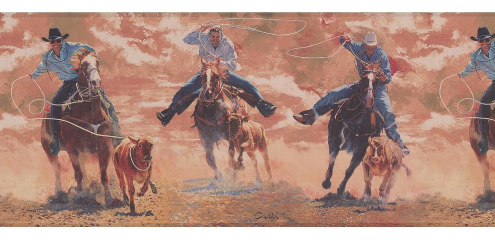 878765 Western Horses Cattle Roping Wallpaper Border (Redish)