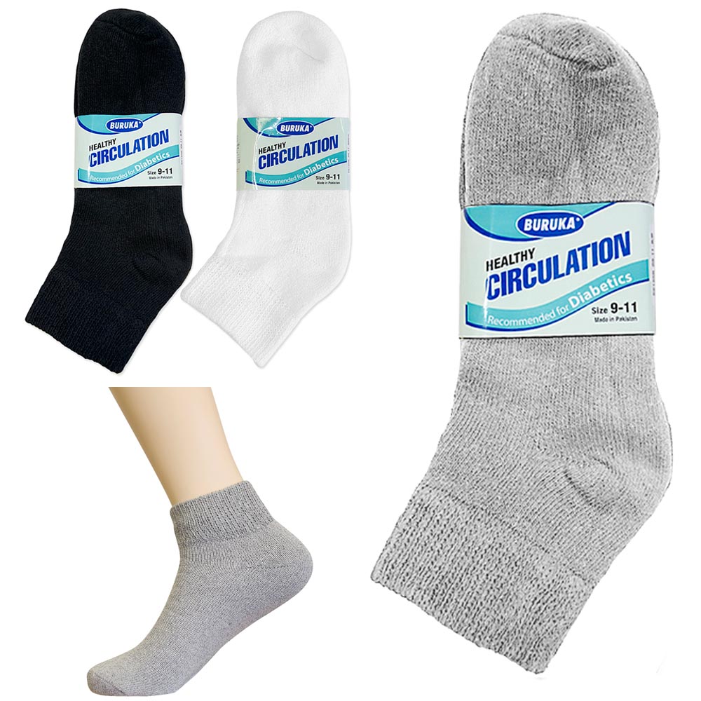 9 Pair Diabetic Ankle Circulatory Socks Health Support Mens Loose Fit Size 9-11The 9 pairs of white unisex circulation diabetic ankle socks are made for those whosuffer from diabetes, edema and or swollen feet.It provides neuropathy comfort support and better circulation.The non-binding, loose-fitting top allows for optimal circulation flowDelicate cotton blend, for extra comfort made with 88% cotton 10% nylon. 2% elastic. Full cushion lining with heel and toe support for pressure relief and maximum foot protectionAvailable in size 9-11.Not only do these socks aid in your health needs but the cushioningalong the bottom provides additional comfort.Machine wash warm, do not bleach, tumble dry low.Please note sock fits a bit snug.9 Pair Diabetic Ankle Circulatory Socks Health Support Mens Loose Fit Size 9-11