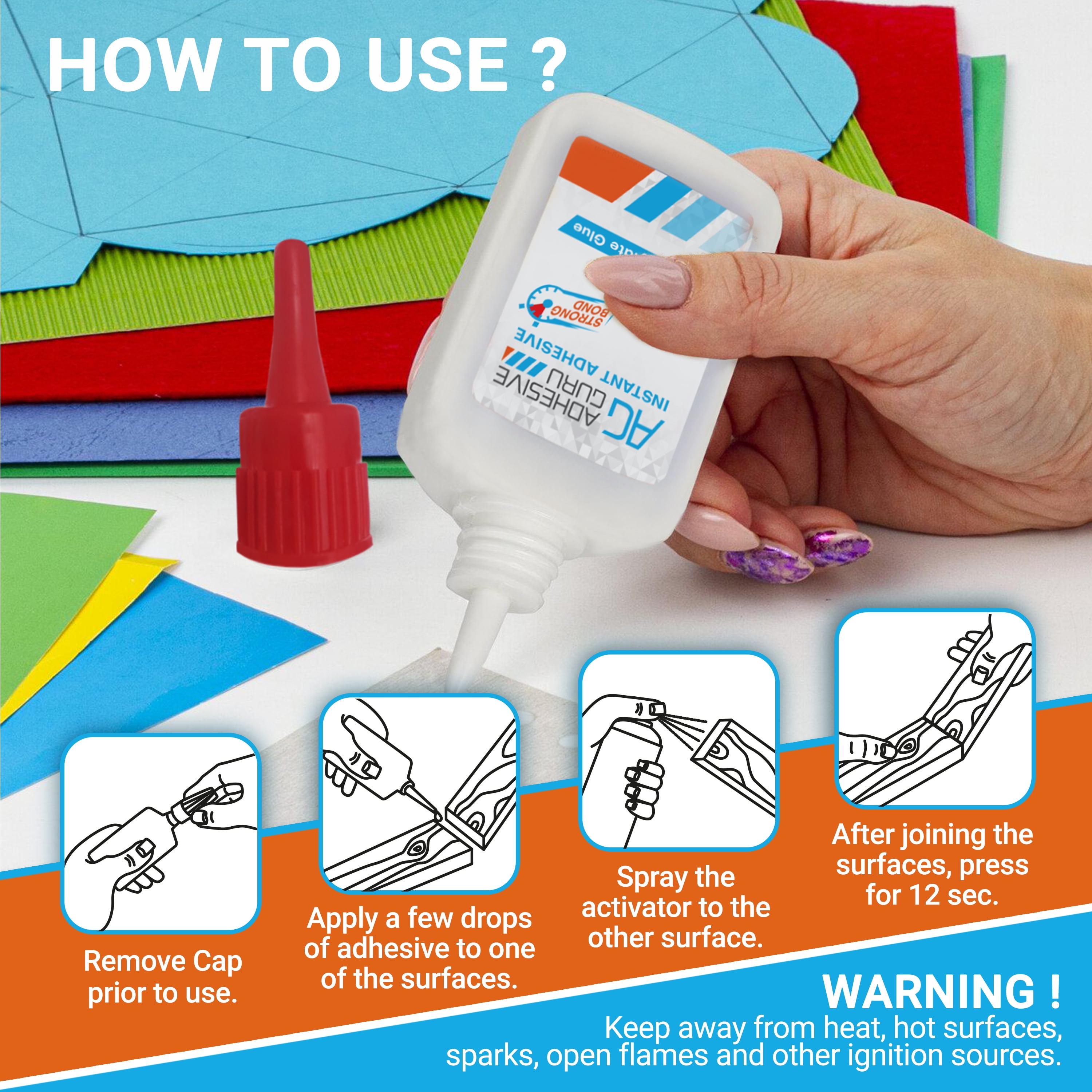 - Bonds Instantly – This super glue kit cuts the project bonding times significantly when compared to a conventional adhesive. Rapid, fast, flash setting formulation that bonds most surfaces within 5-10 seconds. 2-3 drops of CA glue can cover a square inch of the surface that you glue together. After cleaning both surfaces, apply glue to one side of the item and accelerator spray to the other. Press them together, align quickly, and your done.