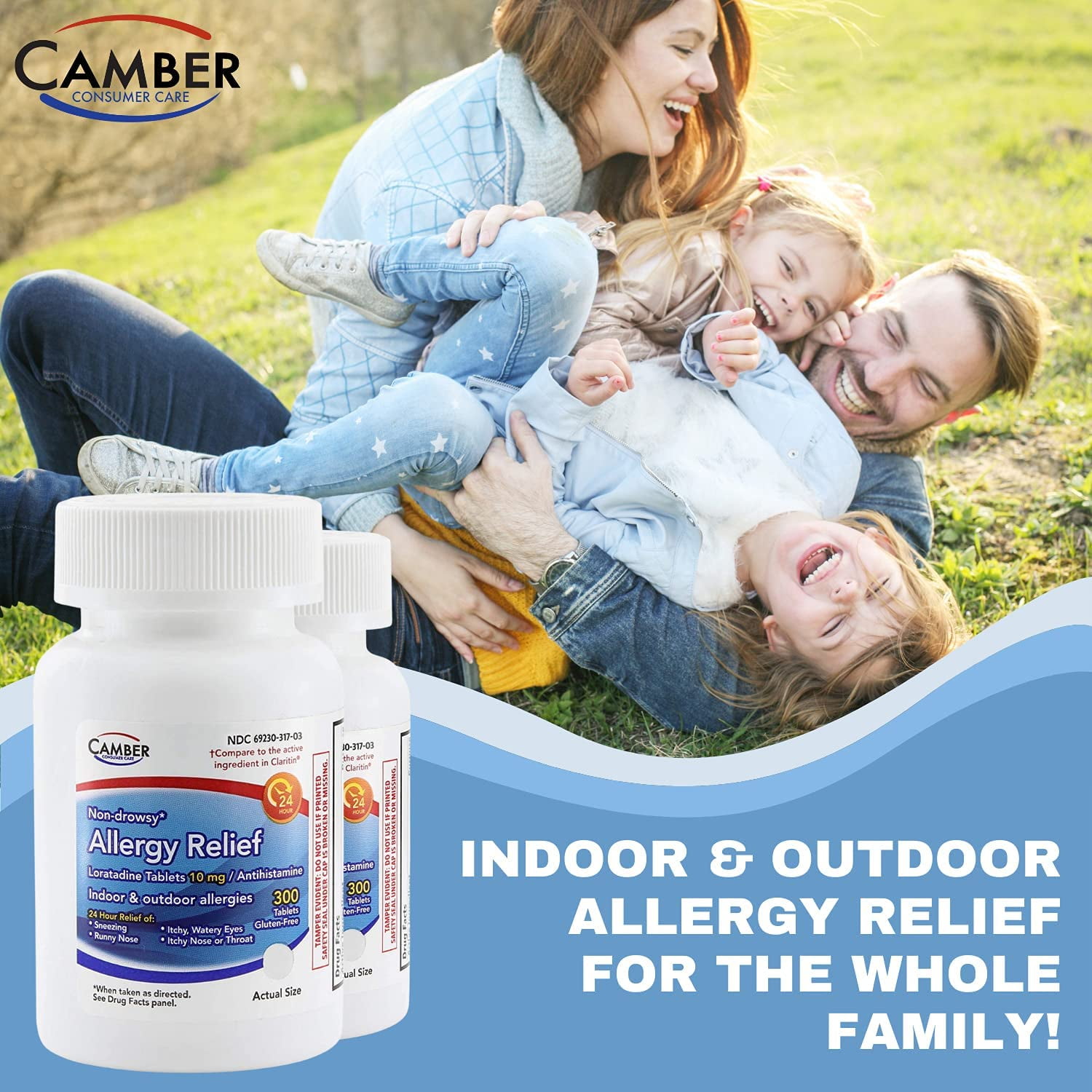 Camber Consumer Care Allergy Relief Loratadine tablets is thoughtfully formulated with Loratadine. Loratadine is an antihistamine that reduces the effects of histamine to treat sneezing, runny nose, watery eyes, and other allergy symptoms.