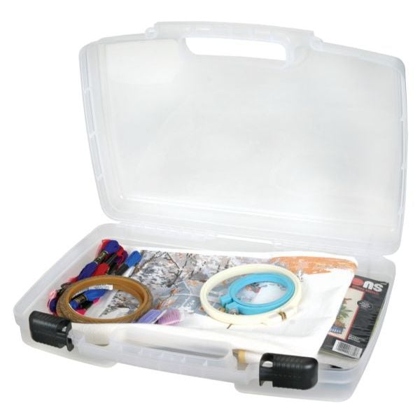 A translucent storage container with clear front window so you can find your supplies and materials quickly and easily. This case features a molded handle, two secure sliding latches with slots for inserting your own lock, and a durable, plastic design that coordinates with any decor and easy to clean. This case measures 12 by 17 by 4-inch.