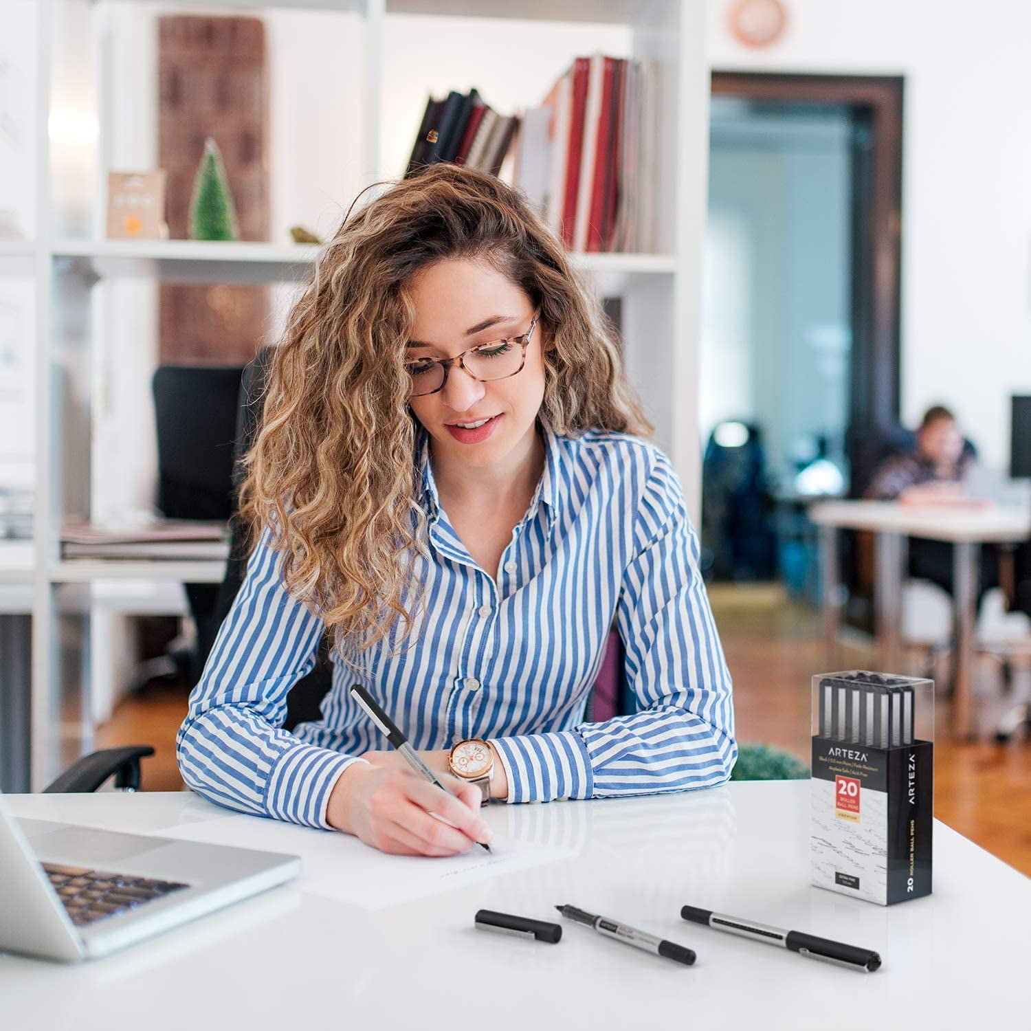Arteza Roller Ball Pens, Black, Extra Fine 0.5 mm – 20 Pack (ARTZ-9216): Experience these smooth-gliding rollerball ink pens that work perfectly for notes, lists, study guides and reminders with this pack of 20. Aside from homework and professional notes, these can be used for sketches and artwork. They’re also great to use in journals, scrapbooks, and calendars since they won’t bleed. Unlike standard liquid ink, these pens use a gel-based formula. They are formulated to be long-lasting and non-fading so you can continue writing without worry.Keep your desk, paper, or hands smudge-free, as the quick-dry formula will keep your work on the paper. These rollerball pens are acid-free, which will keep your pieces bright and bold. Get the ultimate comfort with an ergonomic grip that fits perfectly in your hand, and a durable pocket clip for easy portability. These pens have 0.5mm stainless steel tips that write a precise line every time. Whether you’re at work, school, or at home, have the perfect balance of convenience and practicality and get incredible results every time. Arteza makes art supplies affordable to creators with every budget.