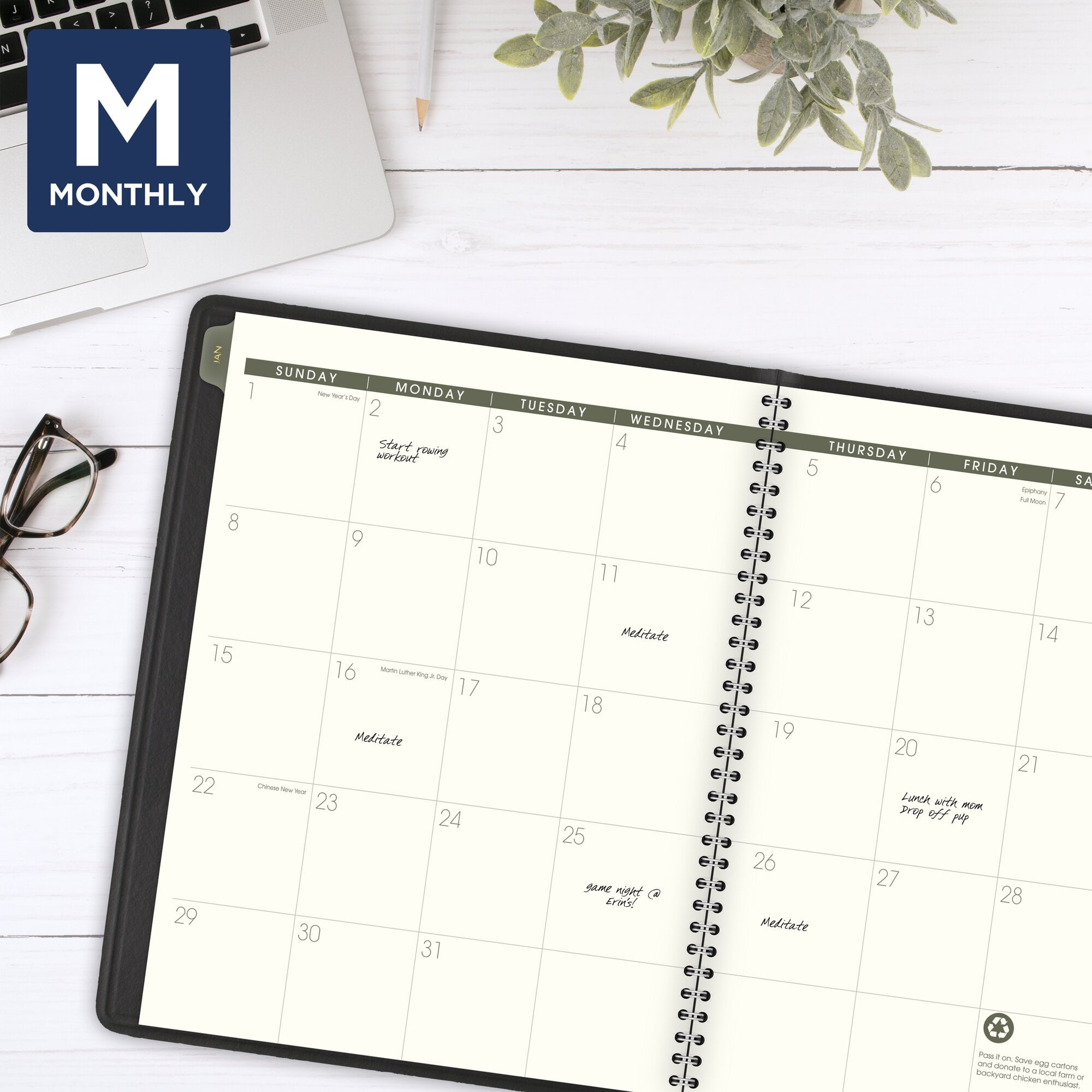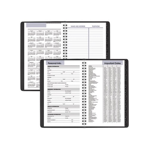 Compact planner will help keep you organized and on schedule with easy planning on the go. Weekly pocket planner features two-page-per-week spreads, perforated corners for easy reference, a tabbed telephone/address section, and simulated leather wirebound cover. Dated planning pages range 12 months from January to December. Each spread includes ruled daily entries in a horizontal format, hourly appointment times from 8 AM to 5 PM on weekdays, Monday-through-Sunday scheduling, count of days/days remaining, a two-color format (black and blue ink), and current and future months reference. Calendar is nonrefillable.