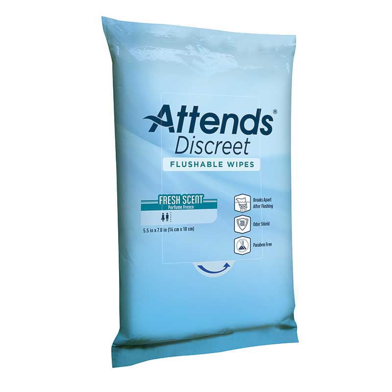 Attends healthcare products attends discreet flushable wipes. part no. adfw20 (20/package)Attends Discreet Flushable Wipes Manufacturers Part # ADFW20 Dimensions: 8 X 4 X .5