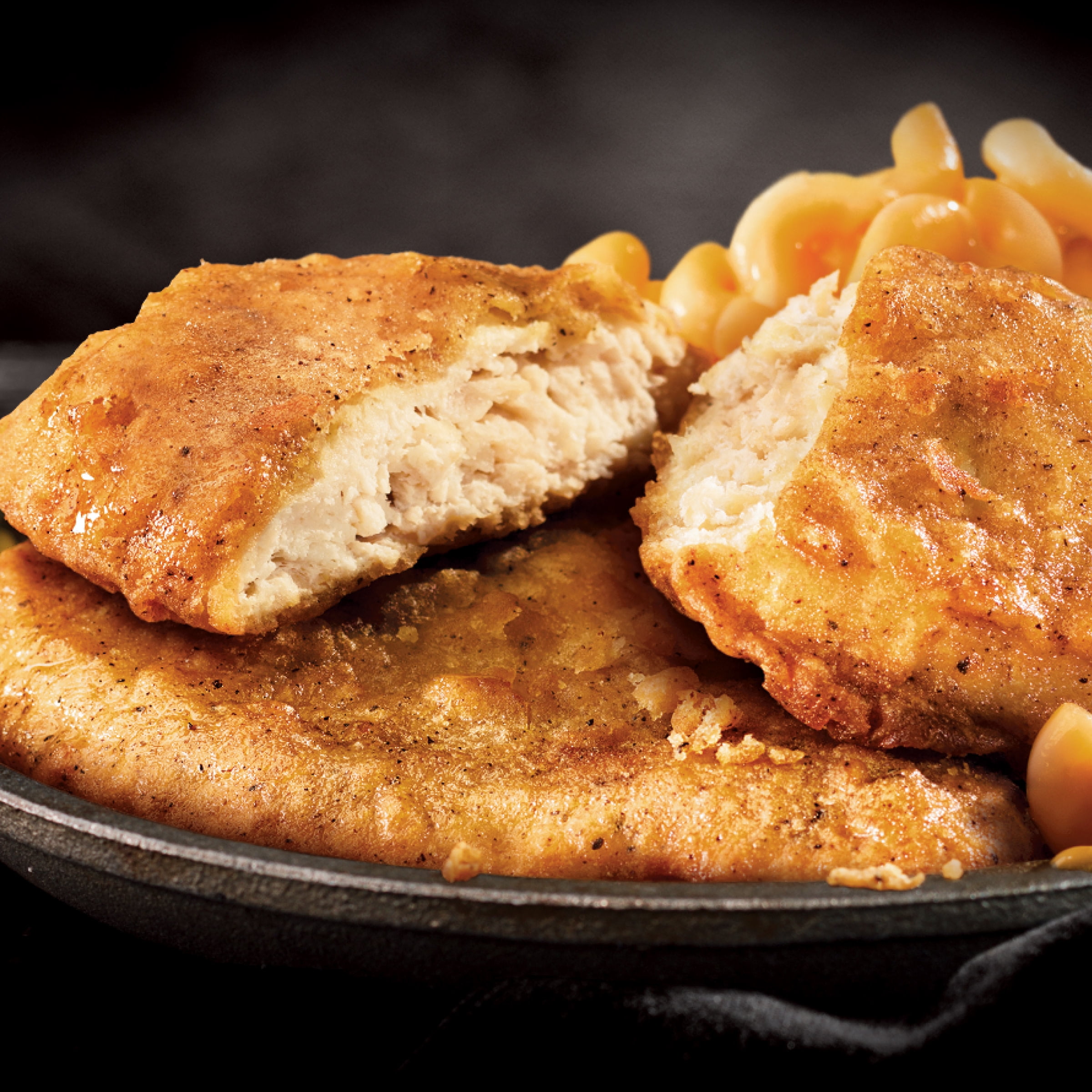 - Boasting seven delicious, juicy ounces of breaded and seasoned fried chicken patties, and with a hearty side of cheddar macaroni and cheese, this meal is positively guaranteed to please