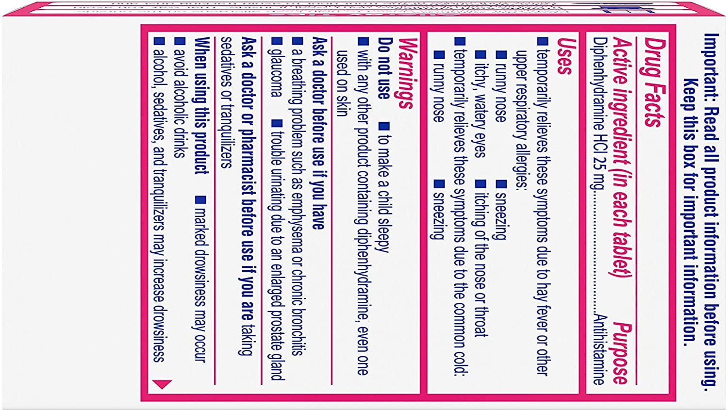 Benadryl allergy ultra tab tablets offer effective relief from allergy and cold symptoms in a small tablet size. Each tablet contains 25 milligrams of the antihistamine diphenhydramine hci to temporarily relieve the allergy symptoms of sneezing, runny nose, itchy throat and nose, and itchy, watery eyes and the cold symptoms of runny nose and sneezing. Benadryl allergy ultra tab tablets are intended for adults and children ages six and up.