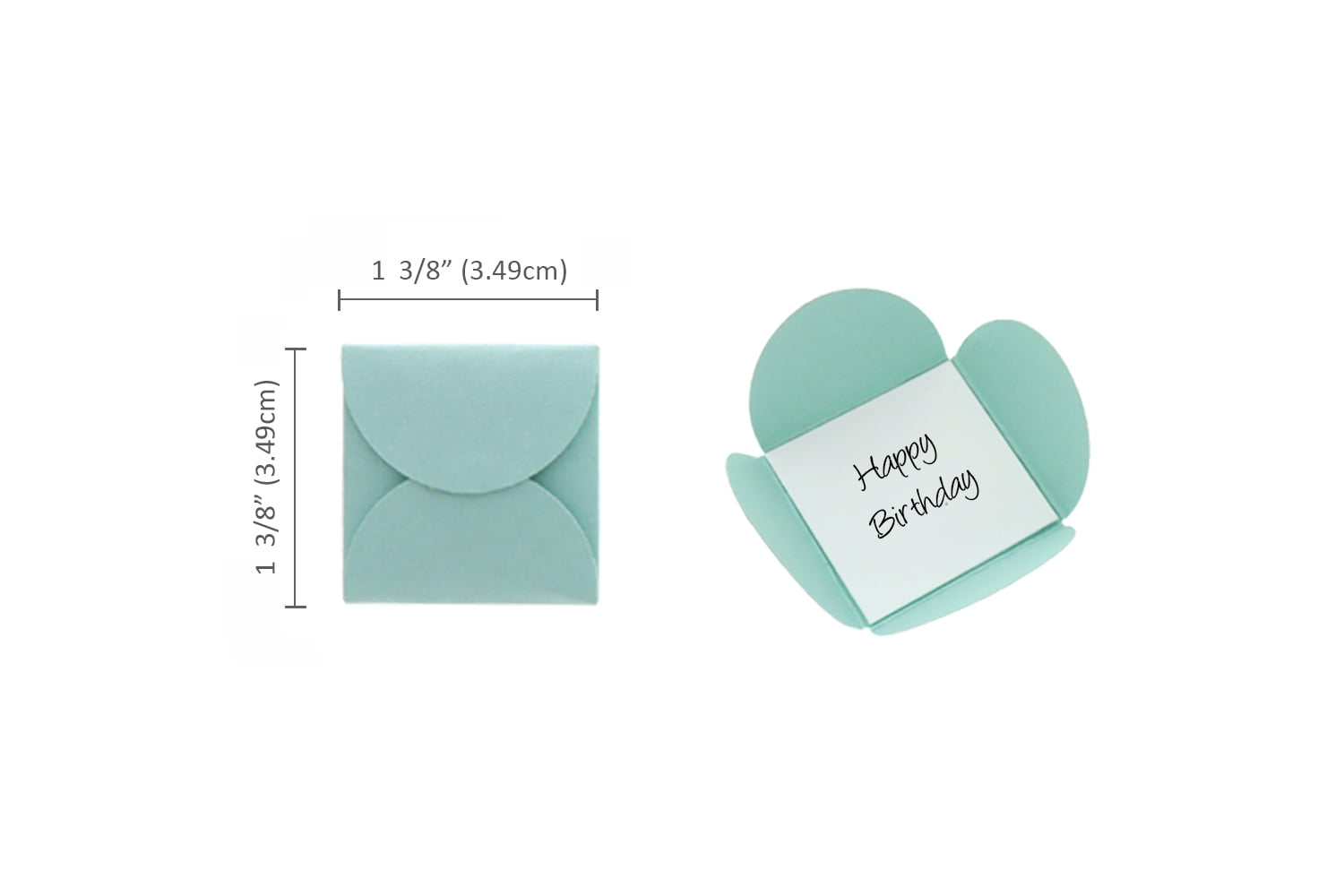 - Punch-Out Dimension: 3 " measured diagonally, a finished envelope (the inside square, not counting the flaps) : 1 3/8" x 1 3/8"