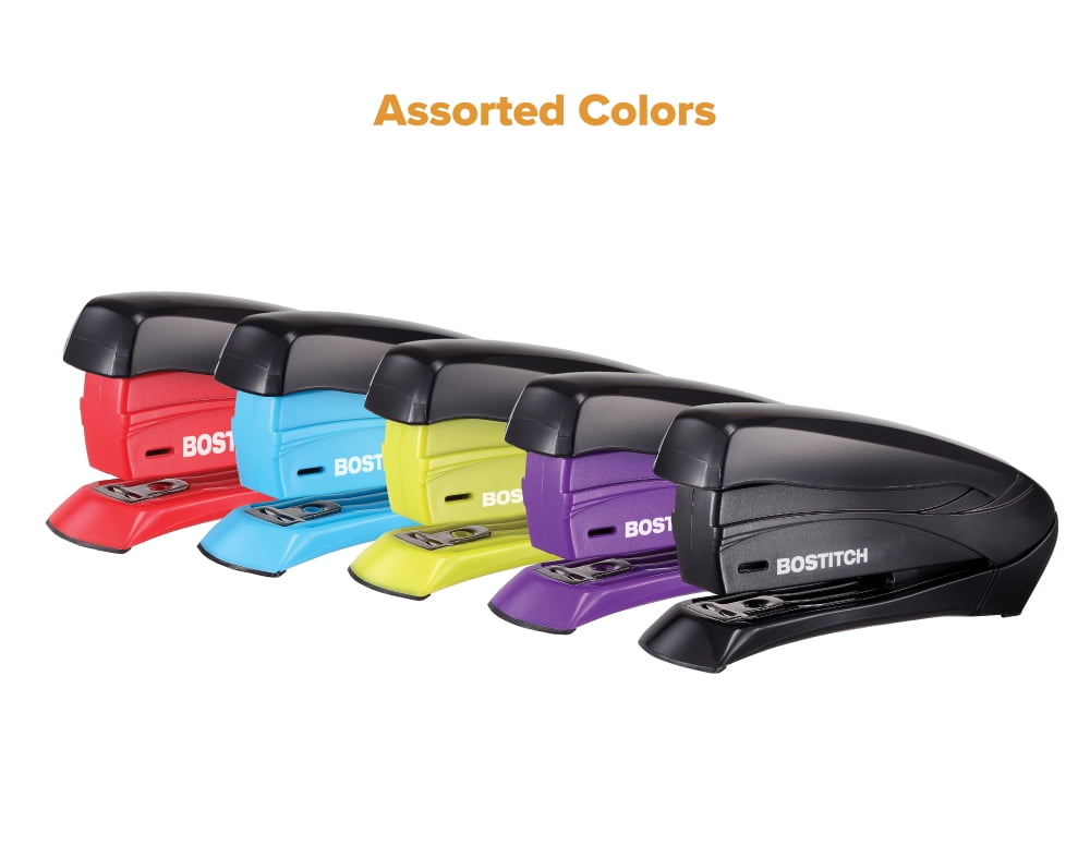 Paperwork can be a hassle, but stapling it shouldn’t be. With the Inspire™ Spring-Powered Compact Stapler’s one-finger™ spring-powered technology by PaperPro, experience fast and easy, jam-free stapling when you need it most at school, work, or the home office. 80% easier than standard staplers, all it takes is the press of a finger to fasten up to 15 sheets. The compact, ultra-lightweight, smooth ergonomic design allows for easier use when held, or taken on-the-go in a backpack or travel bag so you can comfortably staple without missing a sheet. Half strip (105) staple capacity; uses standard staples. For optimal performance, use Bostitch Premium Standard Staples (1901). Comes in assorted colors (no choice of color): Blue, Green, Purple, Red, Black. Three-Year Limited Warranty.