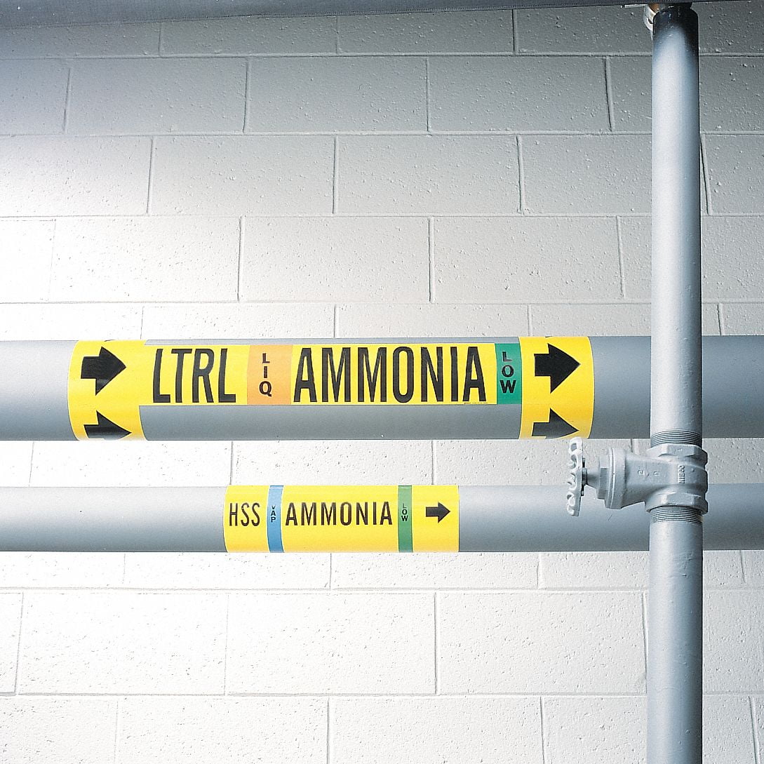Pipe Marker, Pipe Marker Mounting Style Adhesive Pipe Marker, Pipe Marker Legend Ammonia, Legend Text Color Black, Orange, Red, White, IIAR System Abbreviation DC, IIAR Phase LIQ, IIAR Pressure Level High, Character Height 3/4 in, Background Color Yellow, With or Without Arrows Without