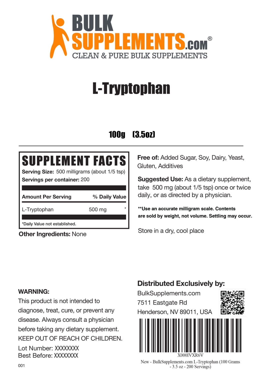 BulkSupplements.com L-Tryptophan Powder Features: