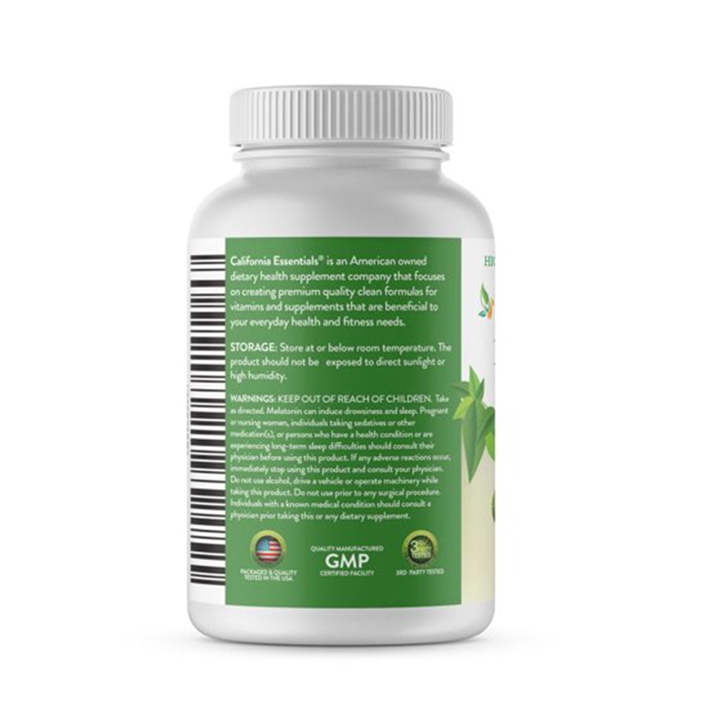 California Essentials Melatonin Capsules is a Dietary Supplement. It helps to Melatonin & hormones your brain produces to regulate your sleep and wake cycles. When levels are unbalanced, insomnia or shorter sleep cycles can occur. A sleep aid may help with California Essentials Melatonin. Help your body achieve the ideal balance of melatonin to provide sustained, restful nighttime slumber without next-day grogginess. With melatonin capsules, you may fall asleep faster and sleep better throughout the night. California Essentials Melatonin veggie capsules offer a natural, non-habit forming, clean formula which may provide you with a more peaceful and uninterrupted natural sleep aid as a more suitable alternative 360 capsules are in each bottle, and the recommended dosage is 1 capsule 15-20 minutes before bedtime. Formulated in the USA, each capsule is non-GMO, vegan, gluten-free, and dairy-free.