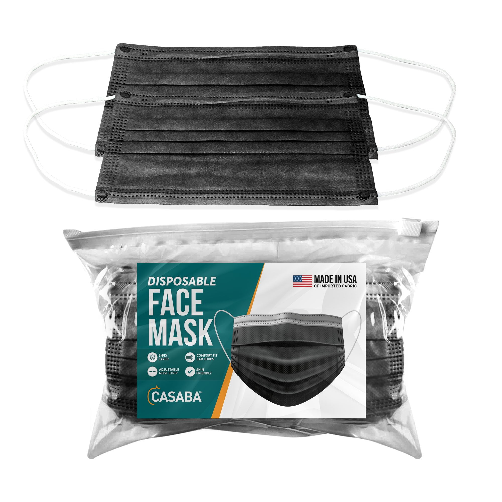 Casaba 50 Pack Black Disposable Face Masks 3-Ply Filter – Made in USA with Imported Fabric