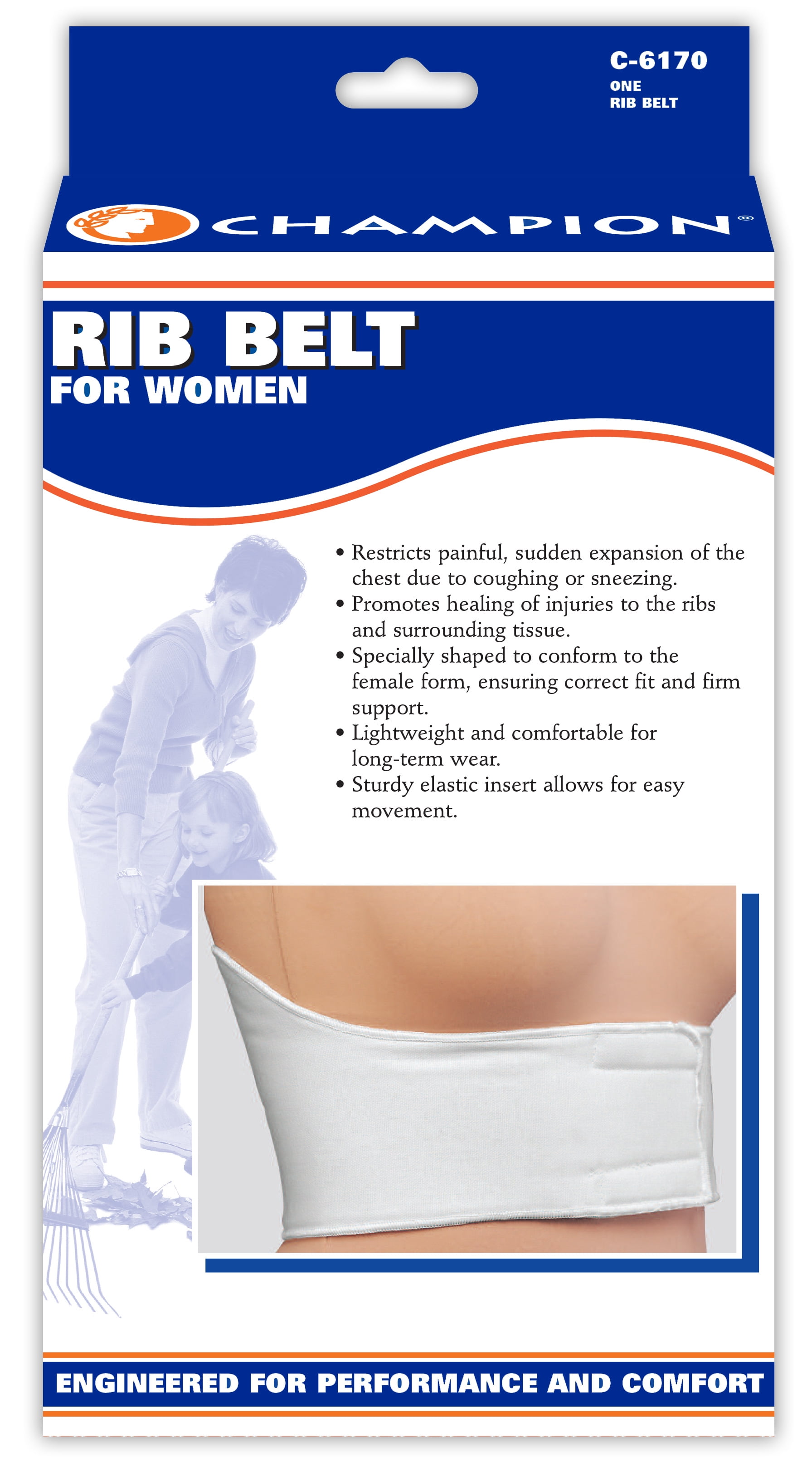 Champion C-6170, Health and Sports Supports: The Champion C-6170 is designed to offer support for injured ribs or strained muscles in the chest or upper back, and helps make breathing and body movements more comfortable. Helps in the treatment of:Compression and support for rib fractures and contusions around the rib cage