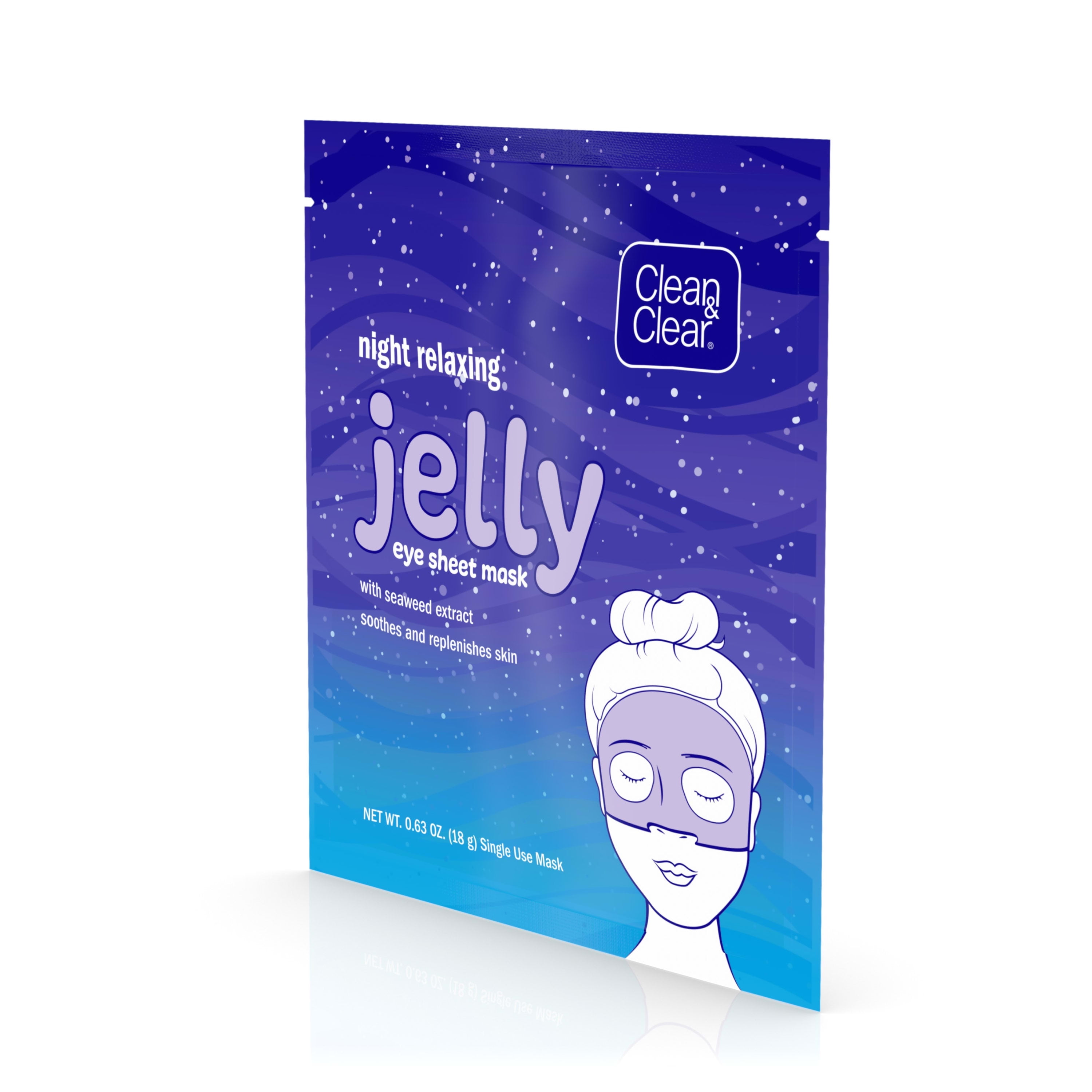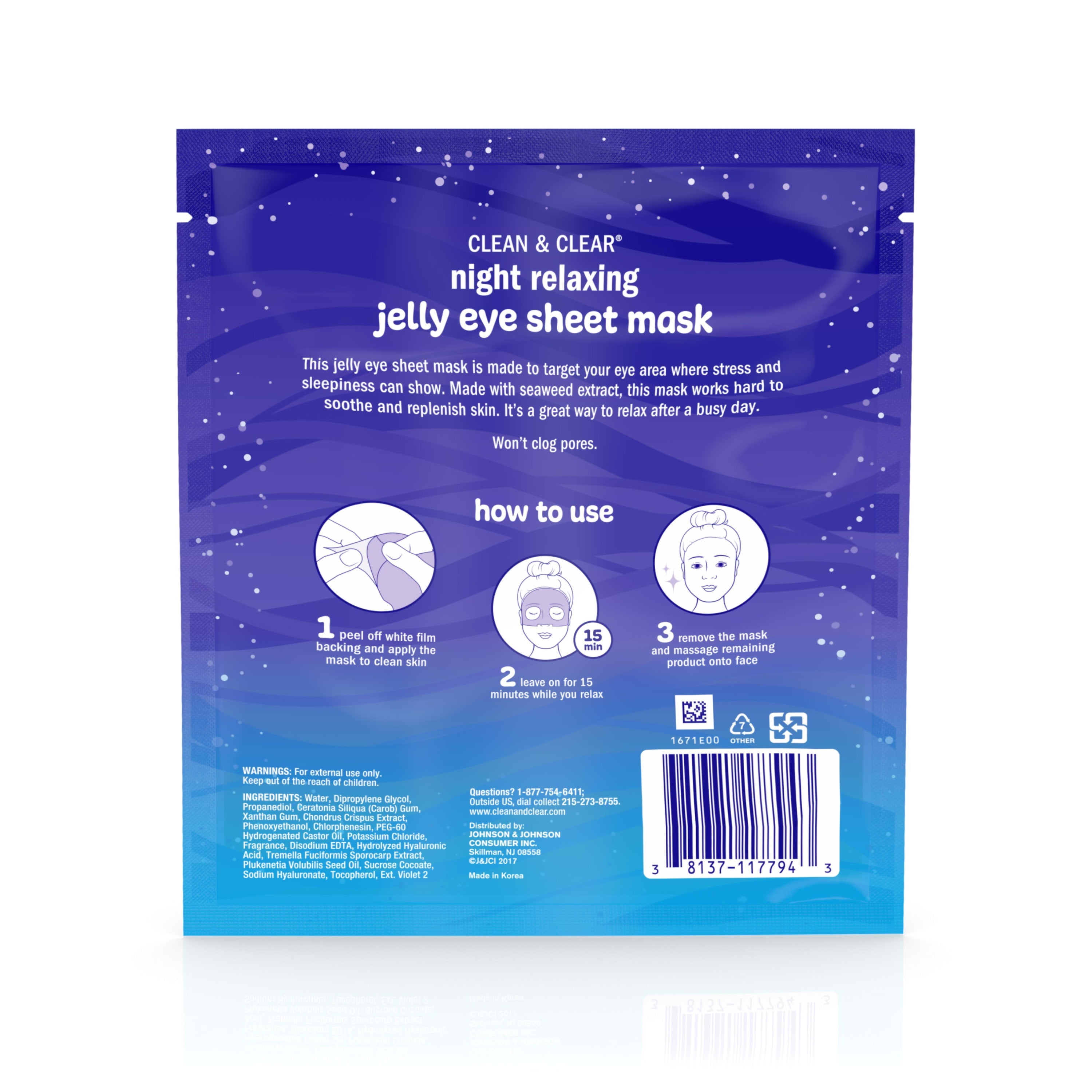 Clean & Clear Night Relaxing Jelly Eye Sheet Face Mask soothes and replenishes skin, targeting the eye area where stress and sleepiness from the day can show. The cooling jelly hydrogel sheet mask is designed to contour to skin to help restore and lock in essential nourishing ingredients and moisture leaving the skin feeling fresh and replenished. Gentle on skin and easy to put on and remove, this ready-to-use eye mask contains seaweed extract and is the perfect way to wind down, de-stress, and relax at night. Use this dermatologist tested, alcohol-free, & non-comedogenic face mask for just 15 minutes to replenish skin after a long day.