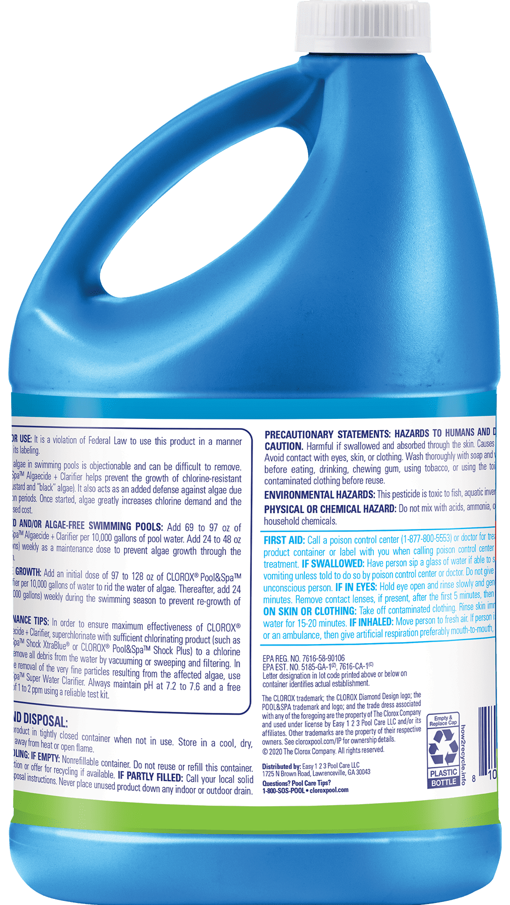 Clorox Pool&Spa Algaecide + Clarifier is a 2-in-1 maintenance product that prevents and treats swimming pool algae. When conditions are right, an algae bloom can occur in a matter of hours. Being one step ahead of algae is crucial because as it grows, chlorine must work harder to keep the pool clean. Since summer brings warmer temperatures and ideal weather for algae spread, the pool is in need of extra protection. This treatment will not only keep the water blue and clear from those uninvited green pests but using this Clorox algaecide clarifier weekly can also stop the spread of algae in the future. This duo also helps the filter remove small particles and dead algae from lingering in the pool. While some algaecides help fix a current problem, Clorox Pool and Spa Algaecide Clarifier combines two essential things: solution and protection, both of which contribute to a cleaner, healthier and more sanitary pool for the whole summer.