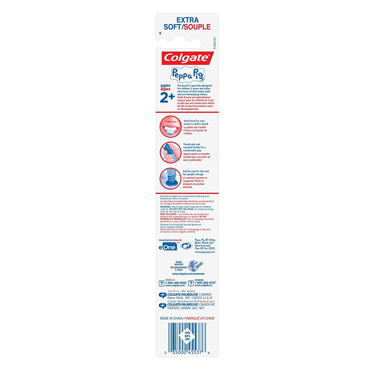 Colgate Kids Peppa Pig manual toothbrush is a fun way to encourage good oral care habits early on! It is specially designed for children with both baby and adult teeth. It is designed with a small head for easy access within a childs mouth, thumb grip and rounded handle for a comfortable grip, and suction cup for easy and fun upright storage.