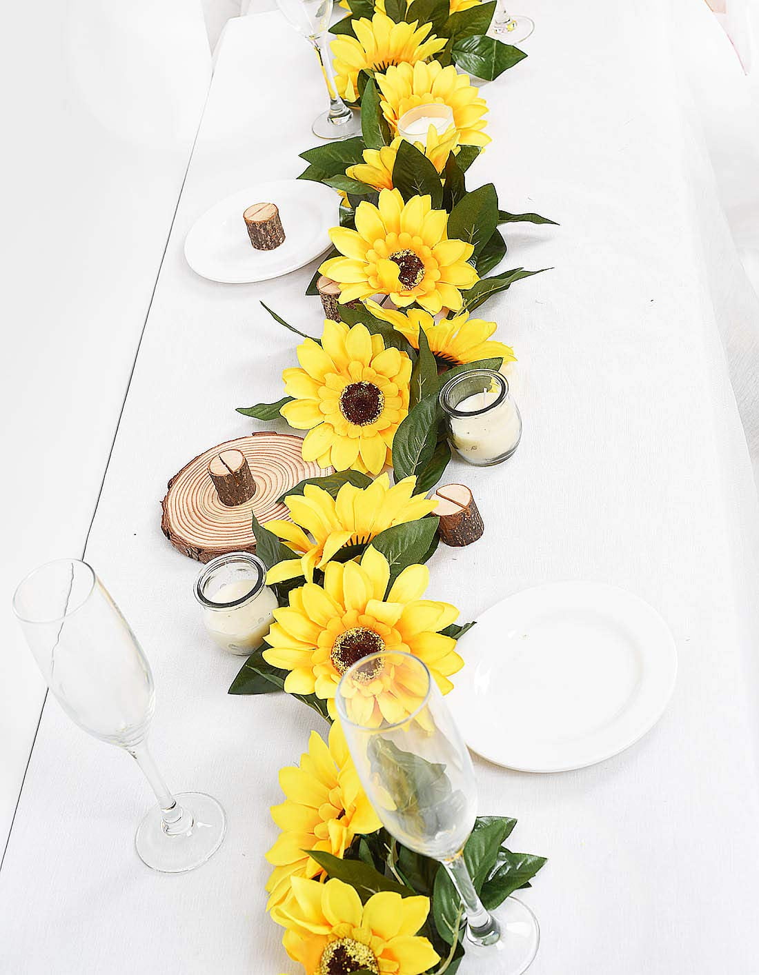 Package includes 2 pcs fake sunflower garlands, the sunflower garland is made from eco-friendly and high quality silk and plastic. It is long-lasting and lifelike. Each garland 7.2 FT long,flowers 5.5 inches in diameter,each garland holds 72 leaves,8 flowers.the perfect way to accent your wedding, There is two pack of artificial sunflower garland per package. Vivid and bright color, beautiful flowers, perfect for weddings, receptions, parties, catered presentations, bridal and baby showers, birthdays, candy buffets, dessert tables and more.you can hang on the wall, door and swing stand… you can also use them decorate