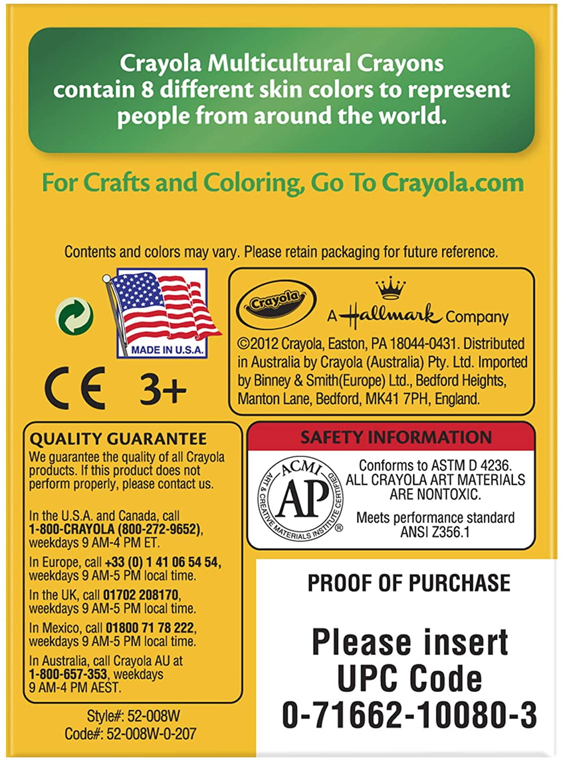 - CRAYOLA MULTICULTURAL CRAYONS: This crayon set features 8 Crayola Crayons in skin tone colors.