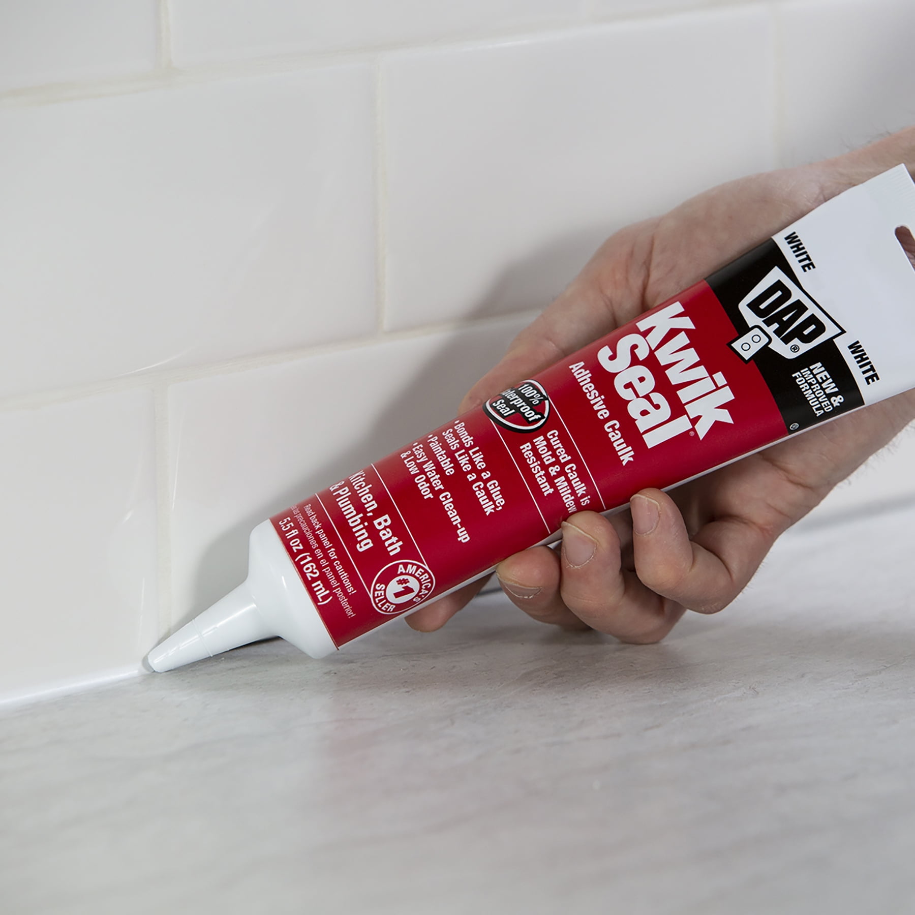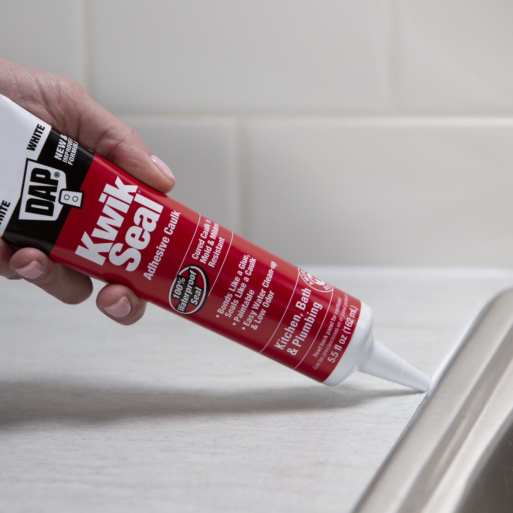 DAP Kwik Seal Kitchen & Bath Adhesive Caulk is an easy-to-use acrylic latex that bonds like a glue and seals like a caulk. Once cured, it is mold and mildew resistant and 100% waterproof. Adhesive is easy to apply, paint-able, low in odor and cleans up easily with water. This white adhesive caulk is ideal for interior applications.