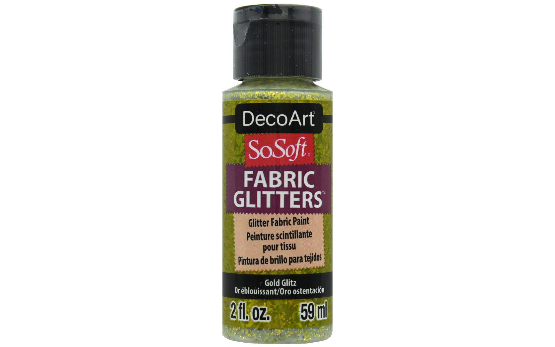 DecoArt SoSoft Fabric Paints is the softest fabric acrylic. It is permanent and requires no heat setting. Once dry it is extremely soft and flexible to the touch. It adheres to all textiles and will not crack, peel, or harden even after repeated washings. 2oz Glitter Gold Glitz- Add glitter accent on top of any SoSoft Acrylic paint or use alone.None