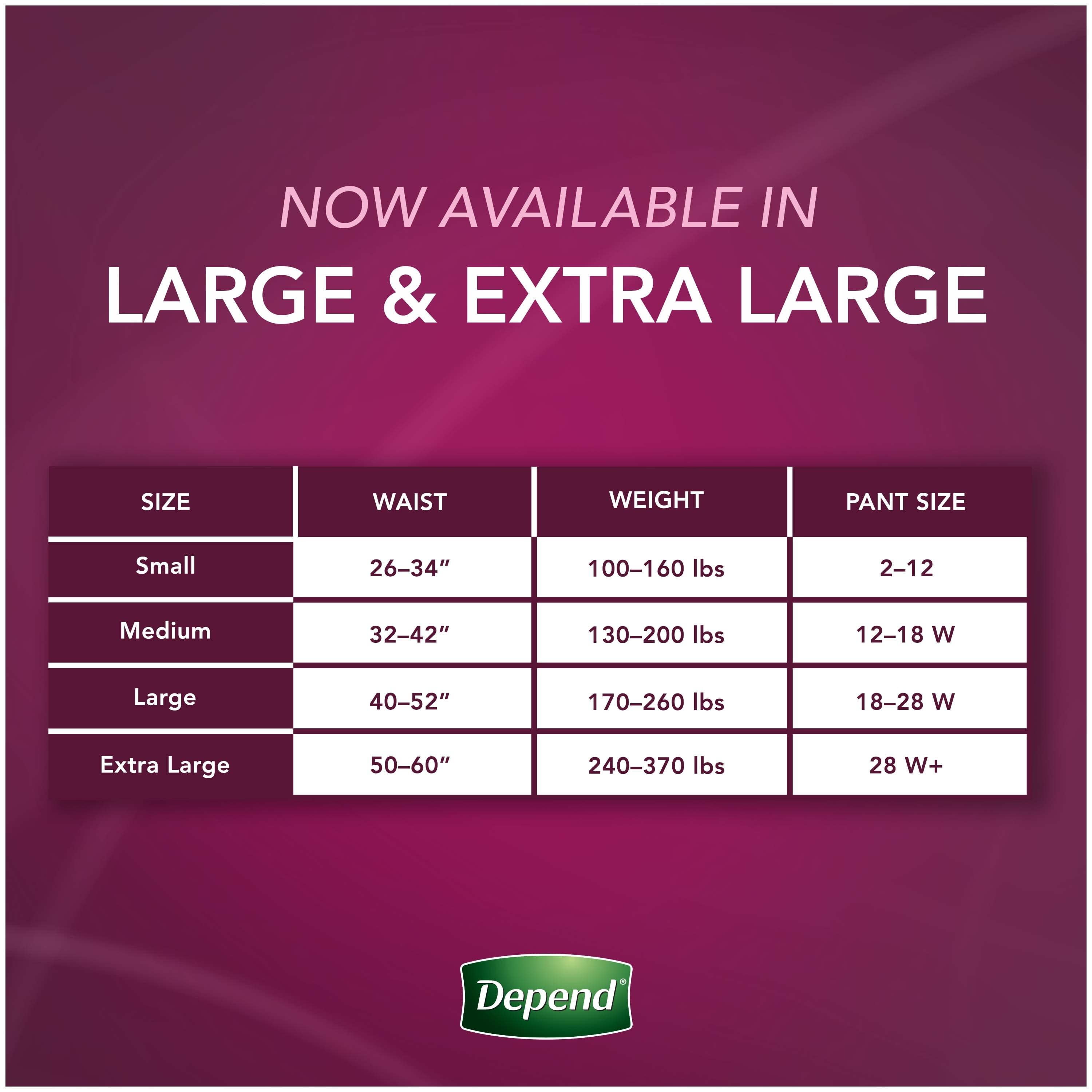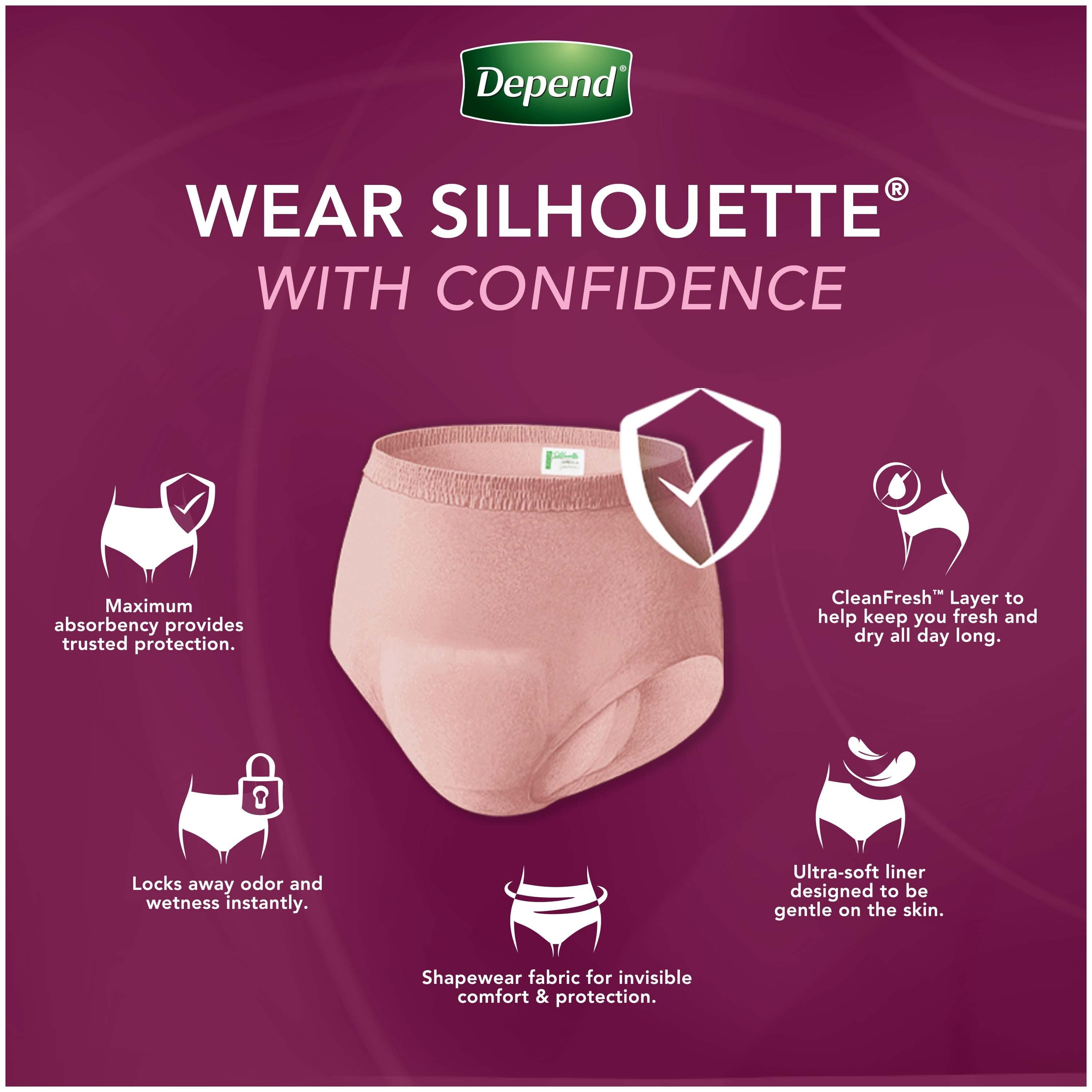 Depend Silhouette Womenâs Incontinence Underwear helps you manage incontinence with confidence. Choose disposable underwear you can trust by using our maximum-absorbency incontinence underwear to protect against bladder incontinence or postpartum bladder leaks. And say goodbye to bulky adult diapers by saying hello to premium shapewear fabric for invisible comfort and protection. Our disposable underwear even features ultra-soft liner to be gentle on skin and tailored leg elastics for a comfortable, snug fit. Plus, our CleanFresh layer locks away odor and wetness instantly to keep you fresh and dry all-day long. Find your perfect look with four sizesâsmall (26â34" waist), medium (32â42" waist), large (40â52" waist) or extra-large (50â60" waist)âand stylish colors, like black, pink, lavender or berry. Some more good news: This product is FSA-eligible in the U.S. Thanks to Depend Silhouette, youâll get maximum protection designed for your body with more sizes, a better fit and outstanding comfort.
