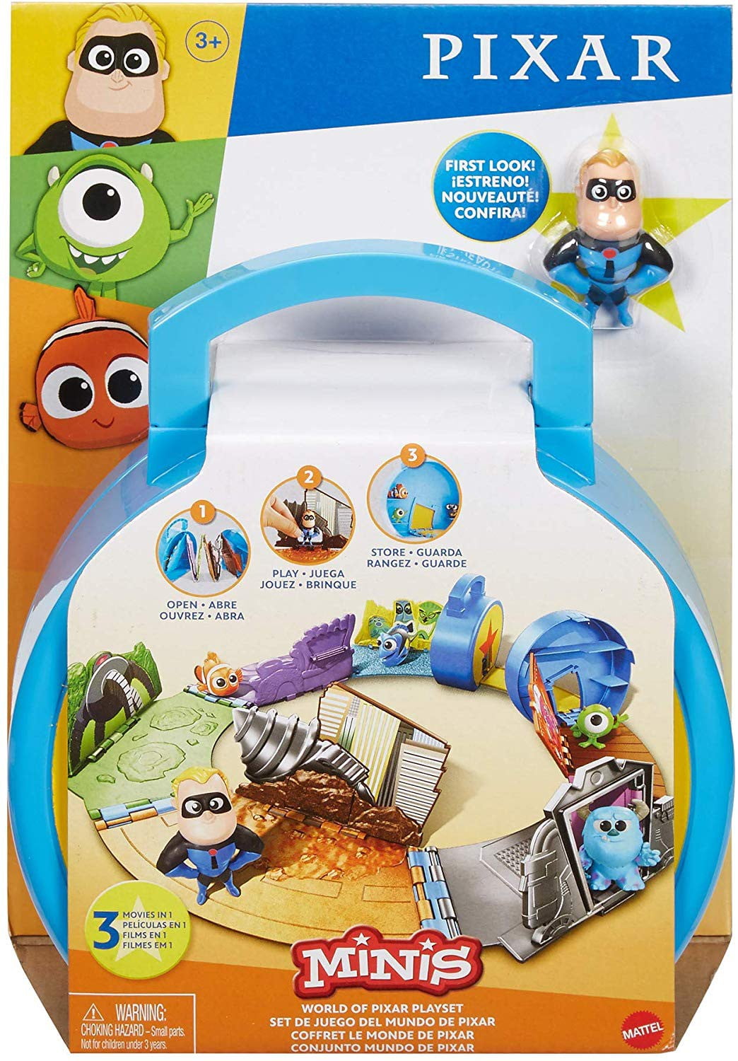 Open the Minis World of Pixar Playset and discover multiple movies in one cool set. Each section unfolds to reveal a location from Disney and Pixar’s Finding Nemo, Monsters, Inc. or The Incredibles. Together it’s a 360-degree circle of Pixar play! Recreate your favorite individual scenes or invent new stories that include all of the special locales. The play set comes with an exclusive Mr. Incredible mini figure in his classic blue power suit, and we have many more characters to choose. At the end of playtime, fold the set up for neat storage or take it to go with the easy grip handle.Disney / Pixar Minis World of Pixar Playset