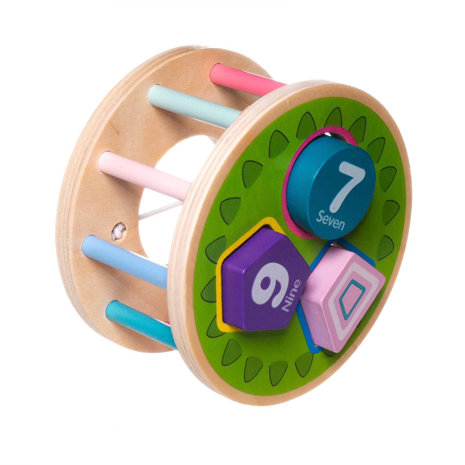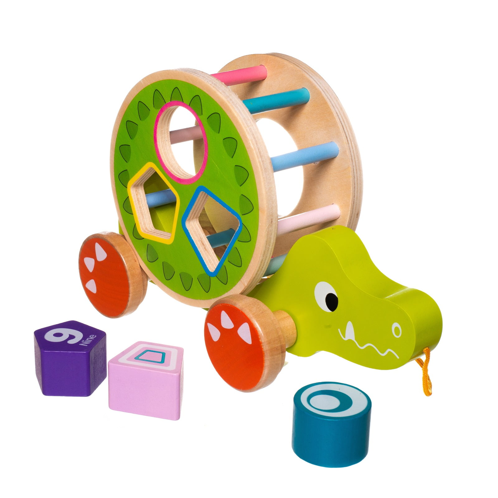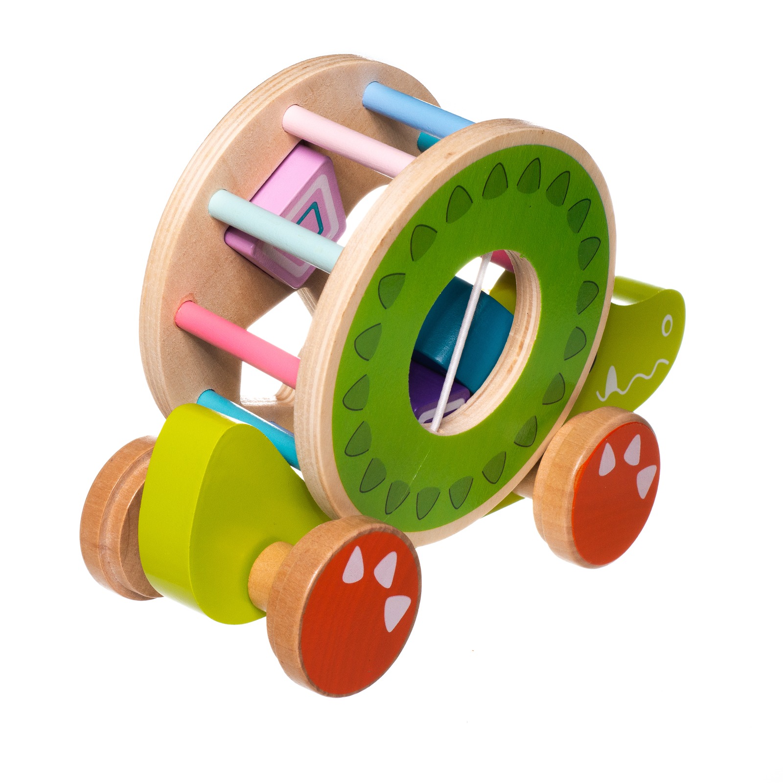 Durable wooden base on wheels with detachable shell. The shell features three differently shaped holes for toddlers to practice shape sorting.