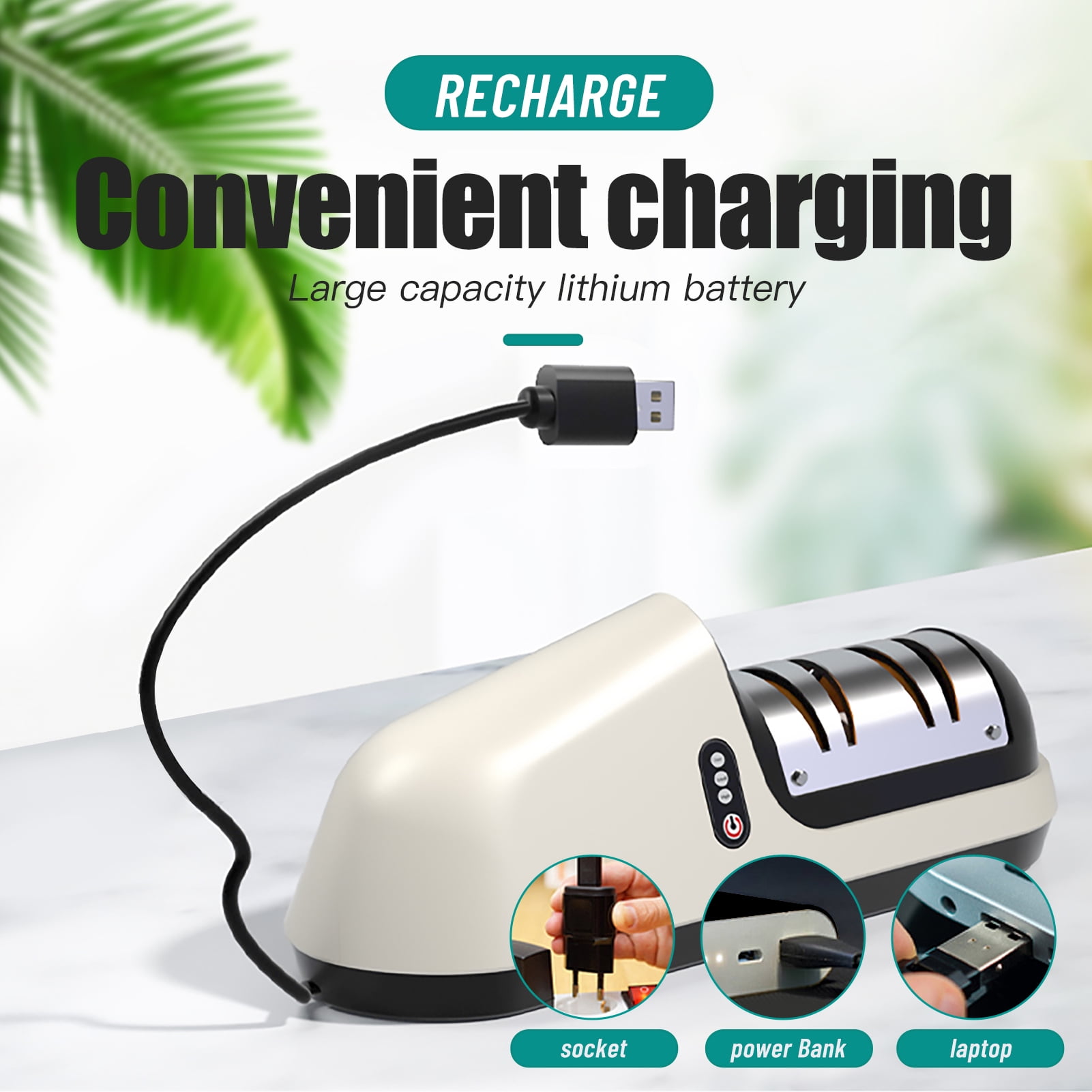 Specifications: Three-speed power adjustment, and the design is more ergonomic switch, eliminating the trouble of getting around. High-capacity battery cyclically recharges, can last for 2 hours. Various charging methods: household sockets, power banks, computer usb, etc. Using high-quality silicon carbide material, it can better protect the tool while grinding. Grinding wheel assembly adopts the precision grinding bearing, the operation is more stable and smooth, and the service life is longer. Three-speed transmission has wider applicability, which can meet the needs of more tools, such as: bone chopper, chopper, multi-purpose knife, chef’s knife, fruit knife, kitchen knife and so on. Surface adopts a bright design, the hand feels gentle and delicate, the simple sleek contour lines and the elegant proportions of the body make it easier to clean and keep clean even in a greasy kitchen environment. Item Name: Electric Knife Sharpener Material: PVC, 304 Stainless Steel, Carbonized Ash Grinding Wheel Grinding Wheel Mesh Number: 180 for Rough Grinding, 240 for Fine Grinding Battery: 18650 Battery Battery Capacity: 1800 mAh Battery (Included) Safety Voltage: 3.6V Features: Durable, Useful, Easy to Use Size: 19cm x 6.5cm x 5cm/7.48" x 2.56" x 1.97" (Approx.) Battery Size: 6.5cm x 1.85cm/2.56" x 0.73" (Approx.) Notes: Due to the light and screen setting difference, the item’s color may be slightly different from the pictures. Please allow slight dimension difference due to different manual measurement. Tips: 1. Due to the overload protection function set in the product, when the product is used, the pressure of the sharpening knife may be too large, which may trigger the product overload protection to stop working. Then, the product will automatically resume normal operation after the overload is ended. 2. When charging, the blue light keeps flashing (the blue lights flash alternately in 3 gear positions), and the blue light is always on when it is fully charged. Switch to different gears while working, and the blue light for different gears will be on. 3. When using for the first time, please charge for more than 8 hours to activate the battery. Package Includes: 1 x Electric Knife Sharpener (Others Not Included) 1 x User Manual