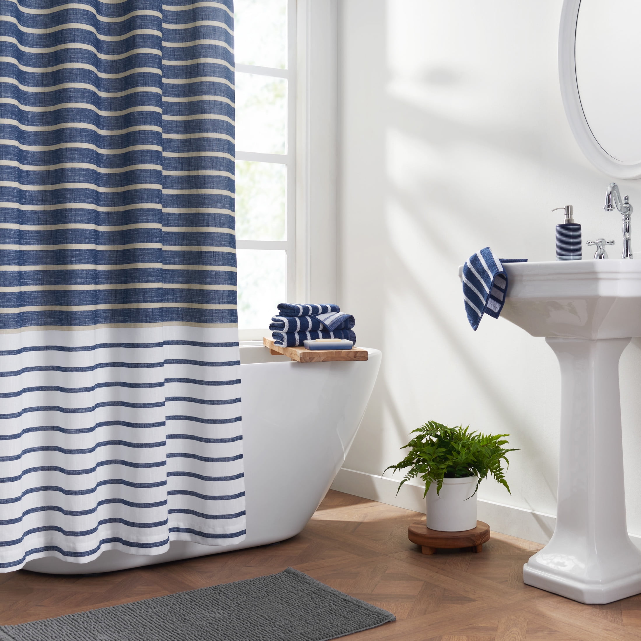 Gap’s first-ever home collection reimagines timeless American style for modern living. Discover quality designs & go-to essentials that instantly refresh each room. Think super-soft bedding, elevated tableware, & more inspired finds for daily life. Inspired by the signature Gap stripe shirt. The Gap Home Easy Stripe Organic Cotton Shower Curtain Navy 72"x72" is made with sustainable yarns and offers casual style for your bathroom decor. Available in a variety of carefully curated colors designed to easily coordinate with other Gap Home bath linens and accessories available exclusively at Walmart.