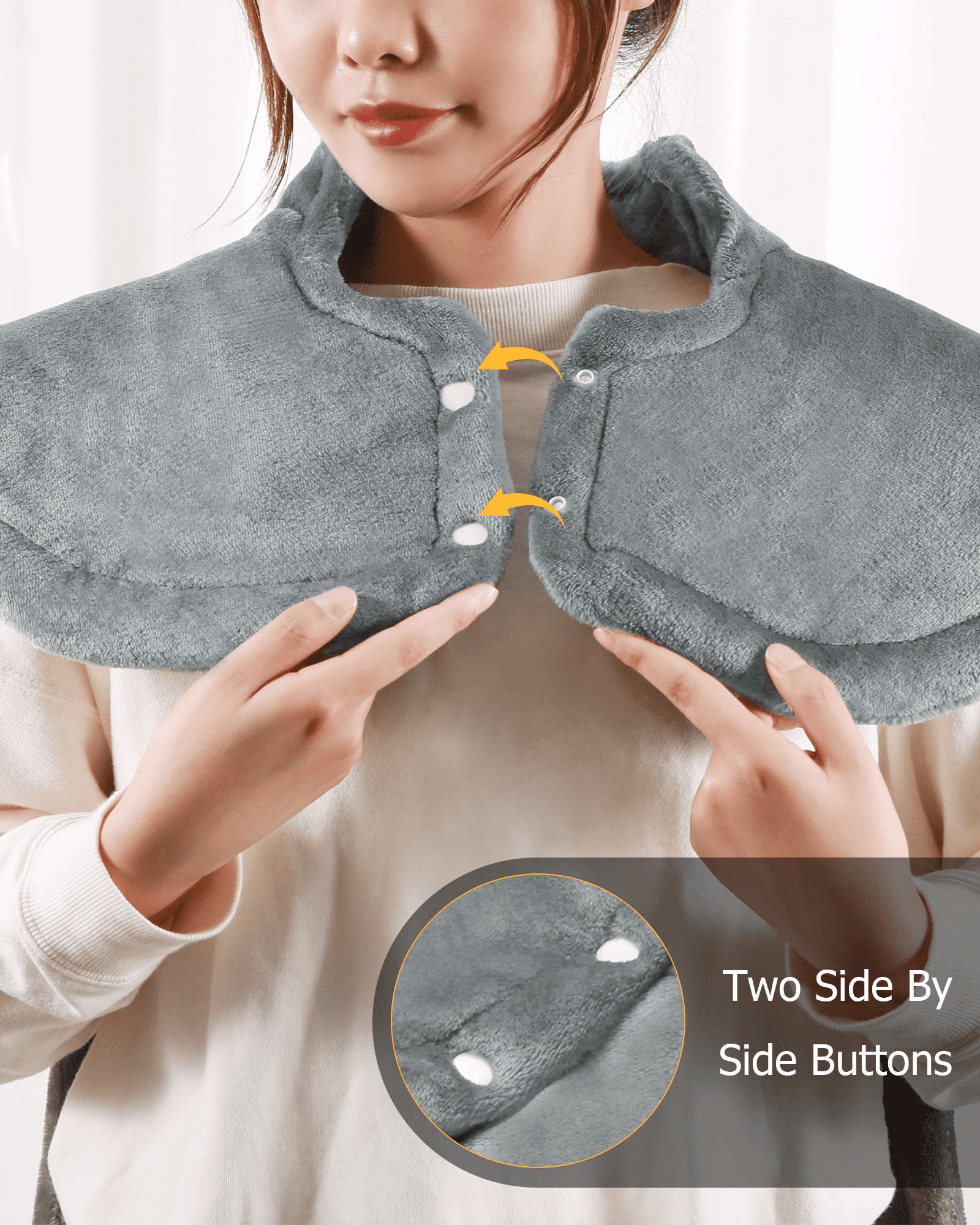 【Hands-free & Comfort】The wrap heating pad features slightly weighted buttom edge. Two snaps that provide a custom fit around the neck, shoulders, and back. And the design of sleeveless will not affect you when at work.