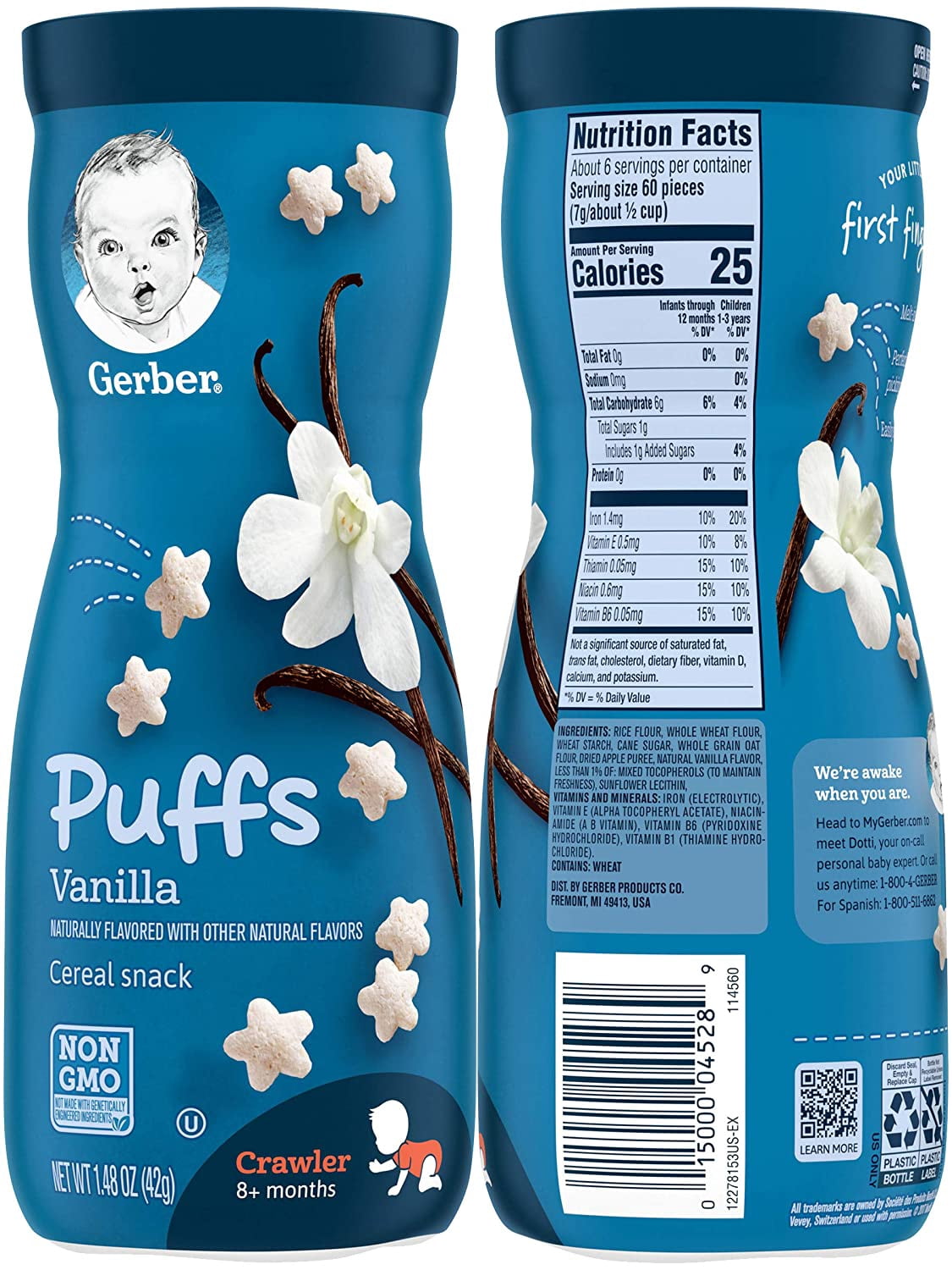 Gerber Puffs make snacking fun! These little baked snacks are made with whole-grain goodness plus they’re so yummy, you might snack on them too! We have a wide variety of flavors to give your baby choices. Gerber Puffs easily stick to little fingers and are perfectly sized for your little one to practice picking things up. Gerber Puffs have 2 grams of whole grains per serving, 5 essential vitamins and minerals and no artificial flavors or artificial sweeteners.