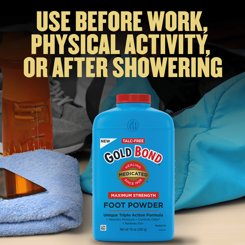 Get relief with Gold Bond Medicated Talc-Free Foot Powder’s unique triple action formula. This maximum-strength medicated powder absorbs moisture, relieves itch, and provides a cooling sensation to help keep feet feeling dry and comfortable. This foot powder also helps control foot odor* to help keep feet smelling happy. You can’t argue with happy feet! Use Gold Bond Medicated Foot Powder after showering, before exercising or any time you’re putting on shoes. Stock up on 10-ounce bottles of Gold Bond Foot Powder so you always have cooling relief on hand. Now talc-free and formulated without parabens and preservatives.Your skin is a champion. One that never settles for silver. Gold Bond is high performance skin care for real life so you can be your best while keeping your skin at its best.*Absorbs odor-causing sweat