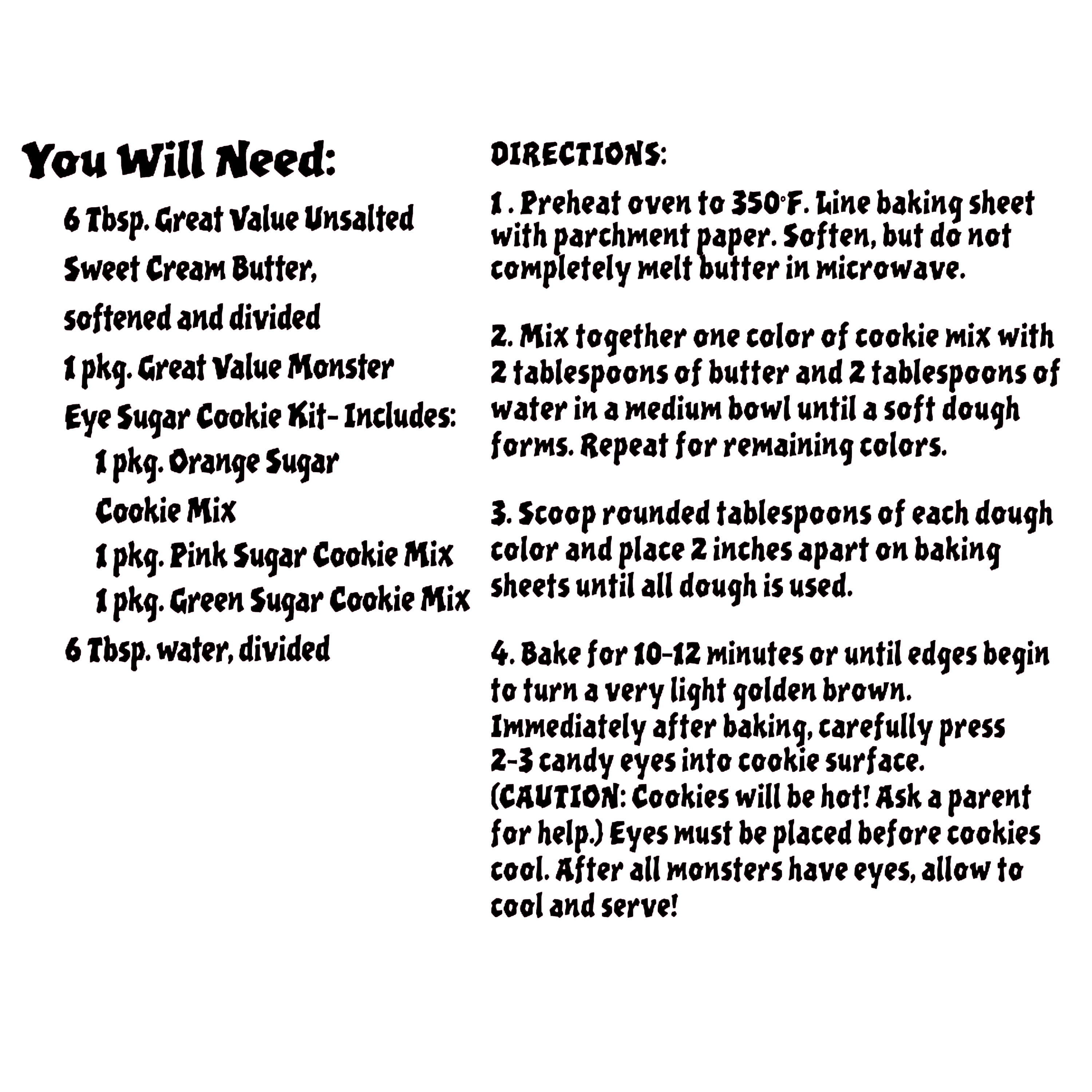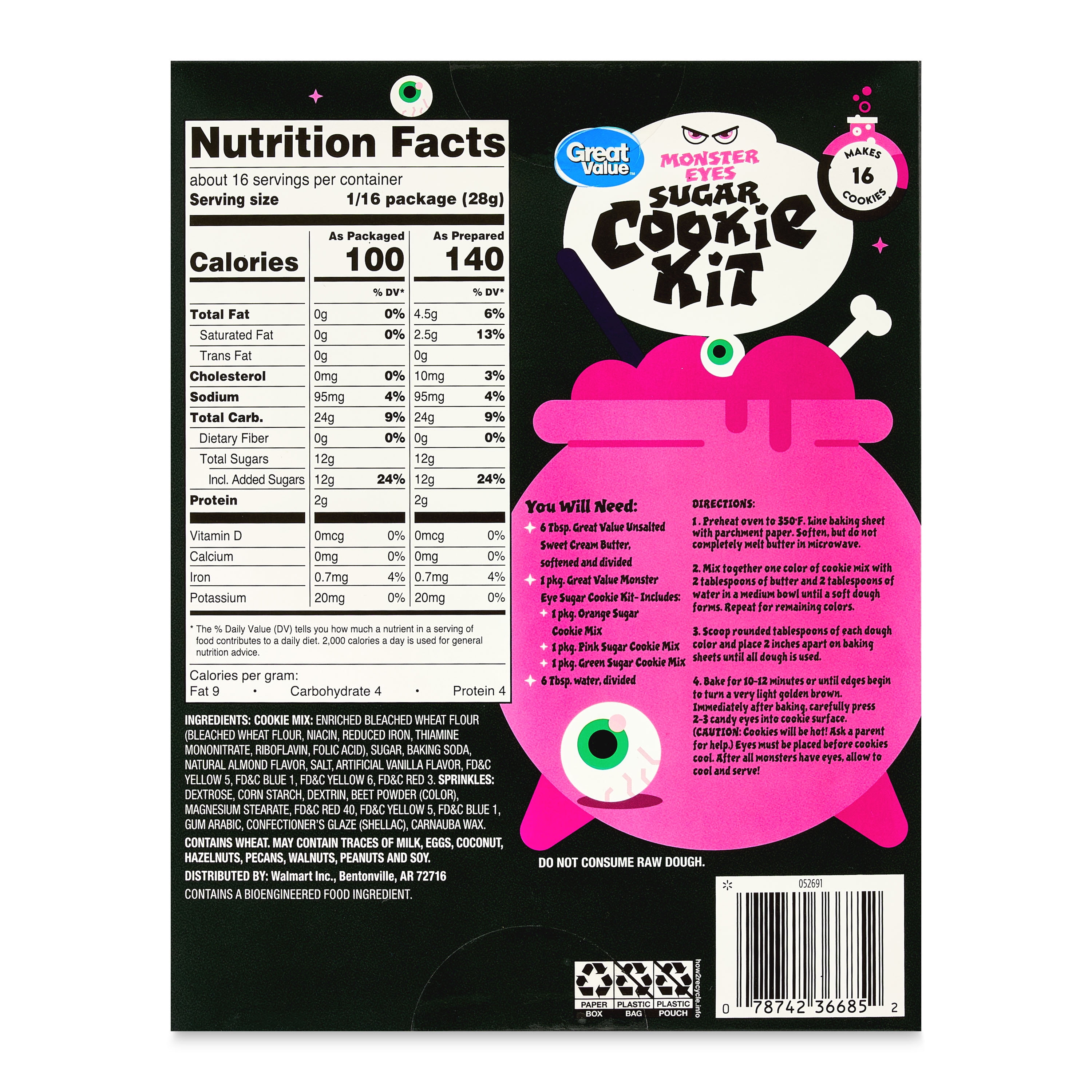 Serve up some spooky treats with the Great Value Monster Eyes Sugar Cookie Kit. With this convenient mix, you can make 16 scary sweets. Butter, water, and this box of mix are all you need to bake fun and seasonal cookies. The kit includes three different colors of sugar cookie mix and candy eyes to make truly spooktacular treats. Serve the cookies at your next dinner party or for a sweet after school or after dinner treat. Surprise your friends and family with the Great Value Monster Eyes Sugar Cookie Kit.