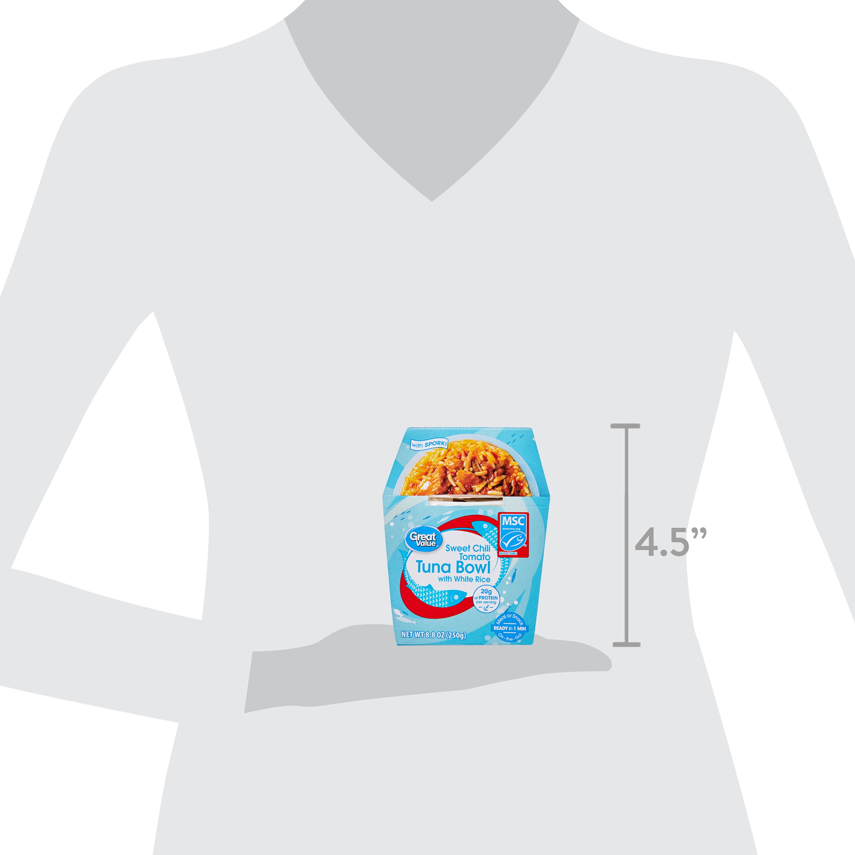 Spice up your meal with the bold Great Value Sweet Chili Tomato Tuna Bowl with White Rice. We start with the delicious tuna and surround it with a flavorful sauce highlighted with a complex fusion of tomatoes, onion, red bell peppers, sweet red chilis, and other spices. When this high-protein blend containing just the right amount of spice and a blast of flavor is combined with the included premium white rice, you have a meal experience that is sure to satisfy your appetite. And it is ready to enjoy after spending 60 seconds in the microwave; including a spork for added convenience. Treat yourself to the exciting flavors of Great Value Sweet Chili Tomato Tuna Bowl with White Rice.