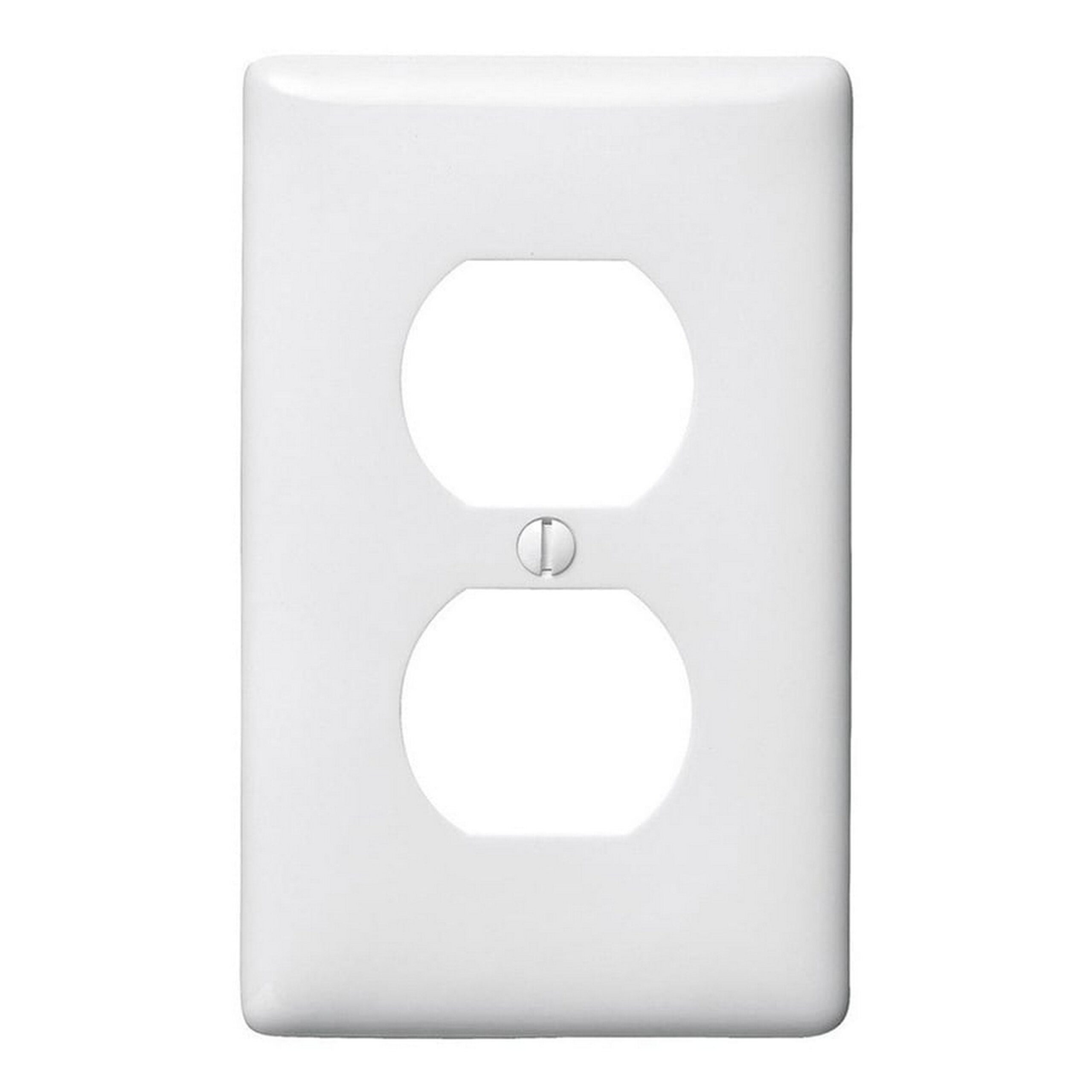 Hubbell 1-Gang White Duplex Standard Wall Plate WP8WZ plastic wallplate is designed for a 1-gang duplex outlet. Smooth finish is attractive and easy to clean. Color-matching screws are included. Standard-size measures Width 2.75" Inches x Height 4.5" Inches