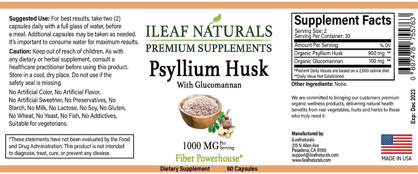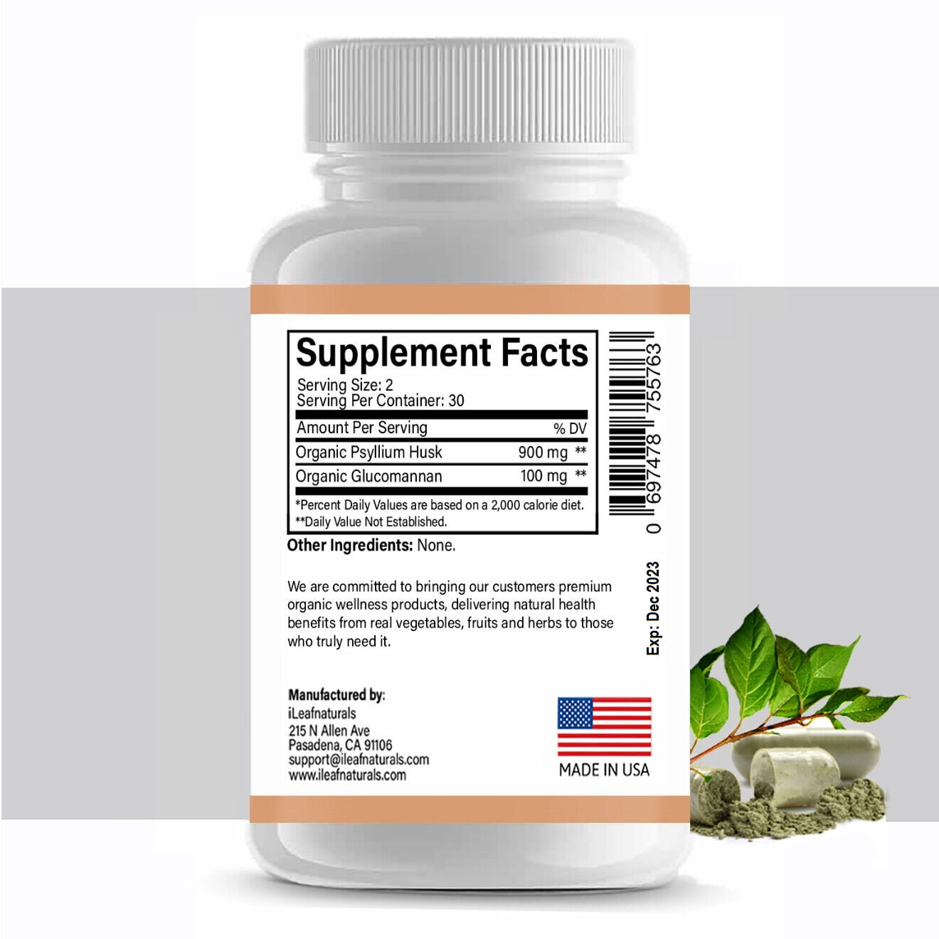 iLeaf Naturals Psyllium Husk with Glucomannan. High Fiber = A Healthier Body. iLeaf Naturals proprietary blend of plant based fibers and herbs help support healthy digestion, elimination and weight loss. Psyllium is produced exclusively for its Mucilage content, a slippery gel-like constituent that is hydrophilic, meaning that its molecular is highly absorbent to moisture causing it to attract and bind to water. Upon absorbing water, Mucilage increase in volume by tenfold or more. It’s important to consume extra water while using Psyllium to increase its effects. Due to its excellent water solubility, Psyllium can become a thick and viscous compound that is not absorbed by the small intestine. Therefore, gives you a feeling of being full that helps you control the amount of food you eat which can aid in weight loss. Moreover, unlike some other portent sources of fiber, the body tolerates Psyllium extremely well. Interestingly, Glucomannan absorbs so much liquid that when added to a glass of water, it turns the entire content into a gel. These unique properties are believed to mediate its effects on weight loss. When combined with Psyllium Husk, research shows that Glucomannan is a powerful weight loss supplement.