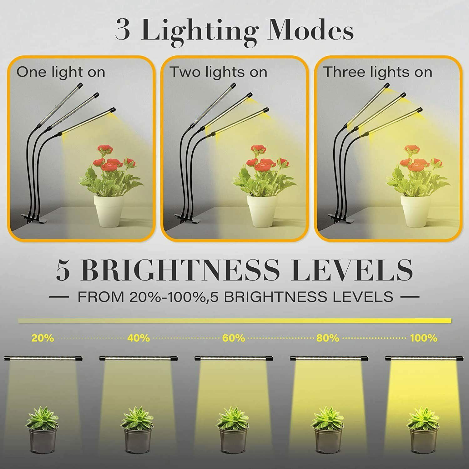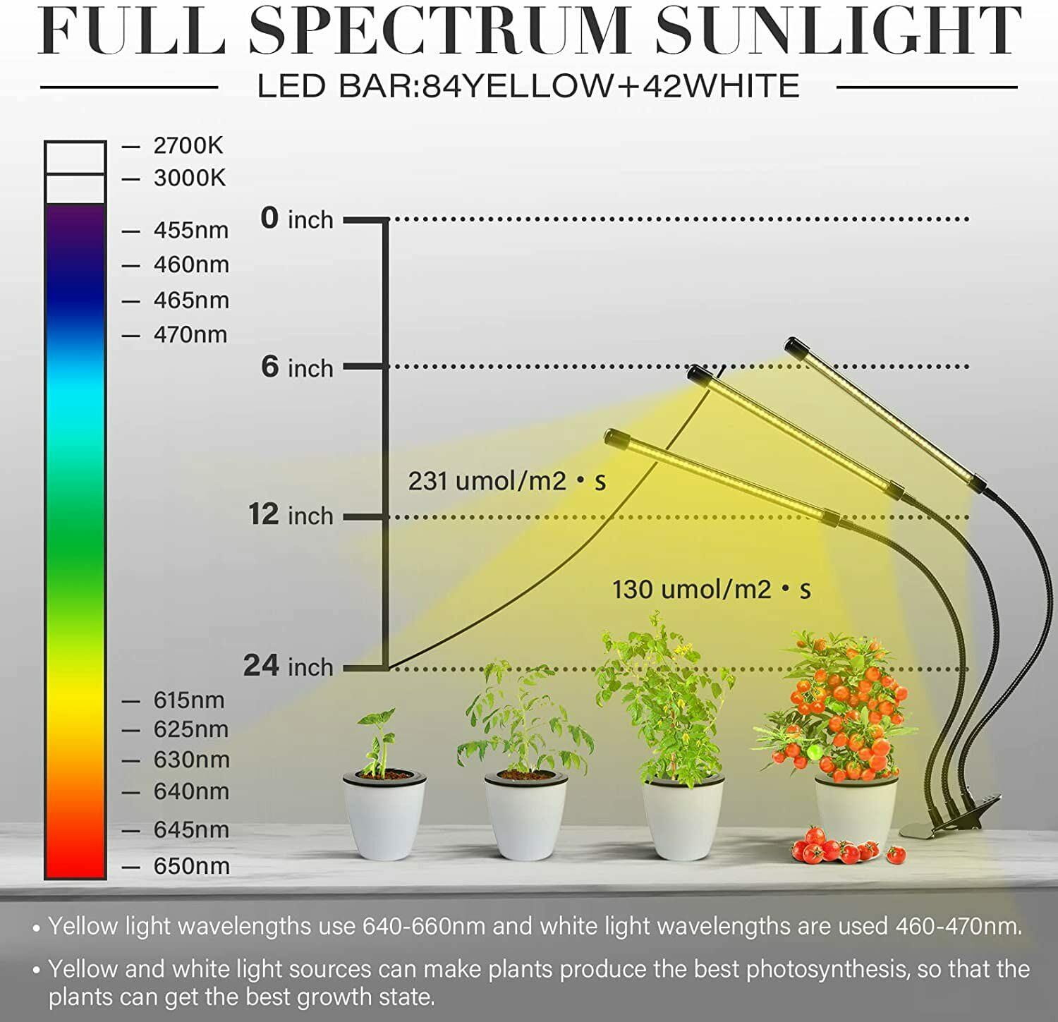 About this item Auto ON/OFF & Timing Function: 3 options-4h/8h/12h. When keeping power, it can automatically turn on and off every day according to your settings, no more manual operation for you. 6000K White Light: Equipped with 84 Yellow + 42 White LEDs, the growing light is similar to the full-spectrum sunlight at noon, that is professionally designed for indoor garden plants. 3 modes & 5 dimmable level: 5 dimmable level of brightness to adjust grow light i5 Dimmable Level: 5 dimmable level of brightness to adjust grow light intensity for different stage of plant growing.ntensity for different stage of plant growing. 3 modes: white, red and full spectrum. Sturdy & Flexible Neck: The grow lights for seed starting with 360-degree flexible neck and with anti-slip clamp allow you to adjust angle and distance between the lamp and plants which provide more efficient illumination light for more plants at the same time. Eco-Friendly & Easy to use: Mercury-free, no UV or IR. No harm to the environment and your family. The led growing light has a USB connector which makes it convenient to connect.